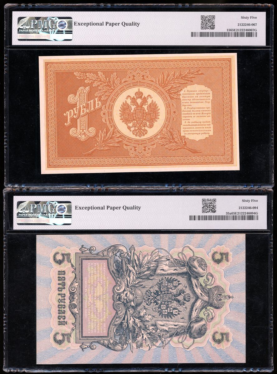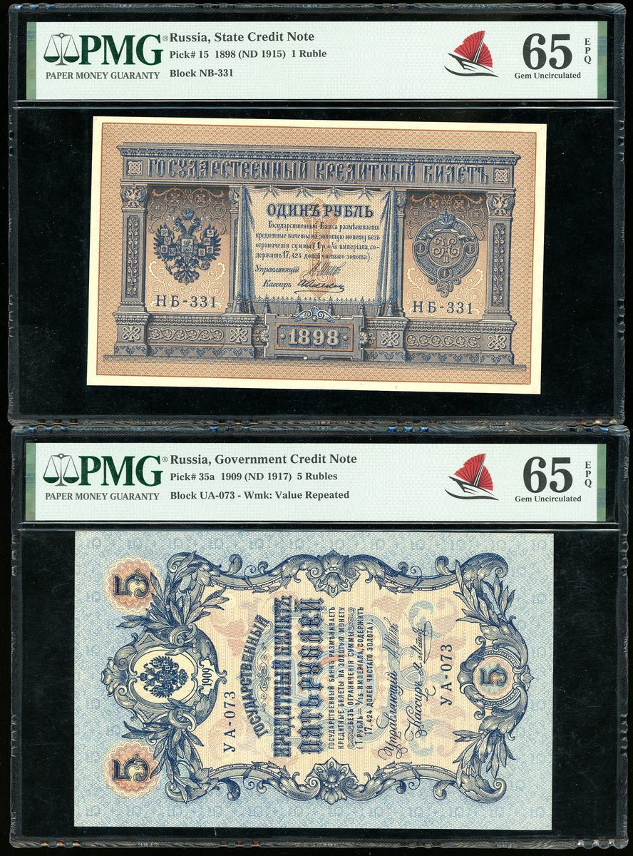 Gosudarstvenniy Bank, Russia, 1 ruble 1915 and 5 rubles 1917, (Pick 15, 35a), both graded PMG 65EPQ Gem Uncirculated (2)