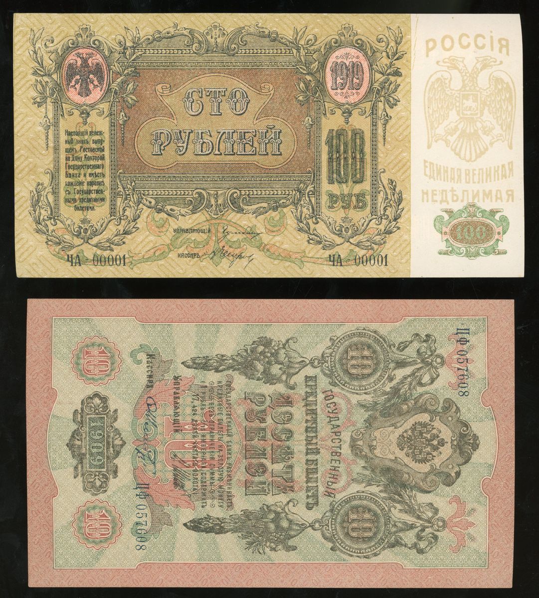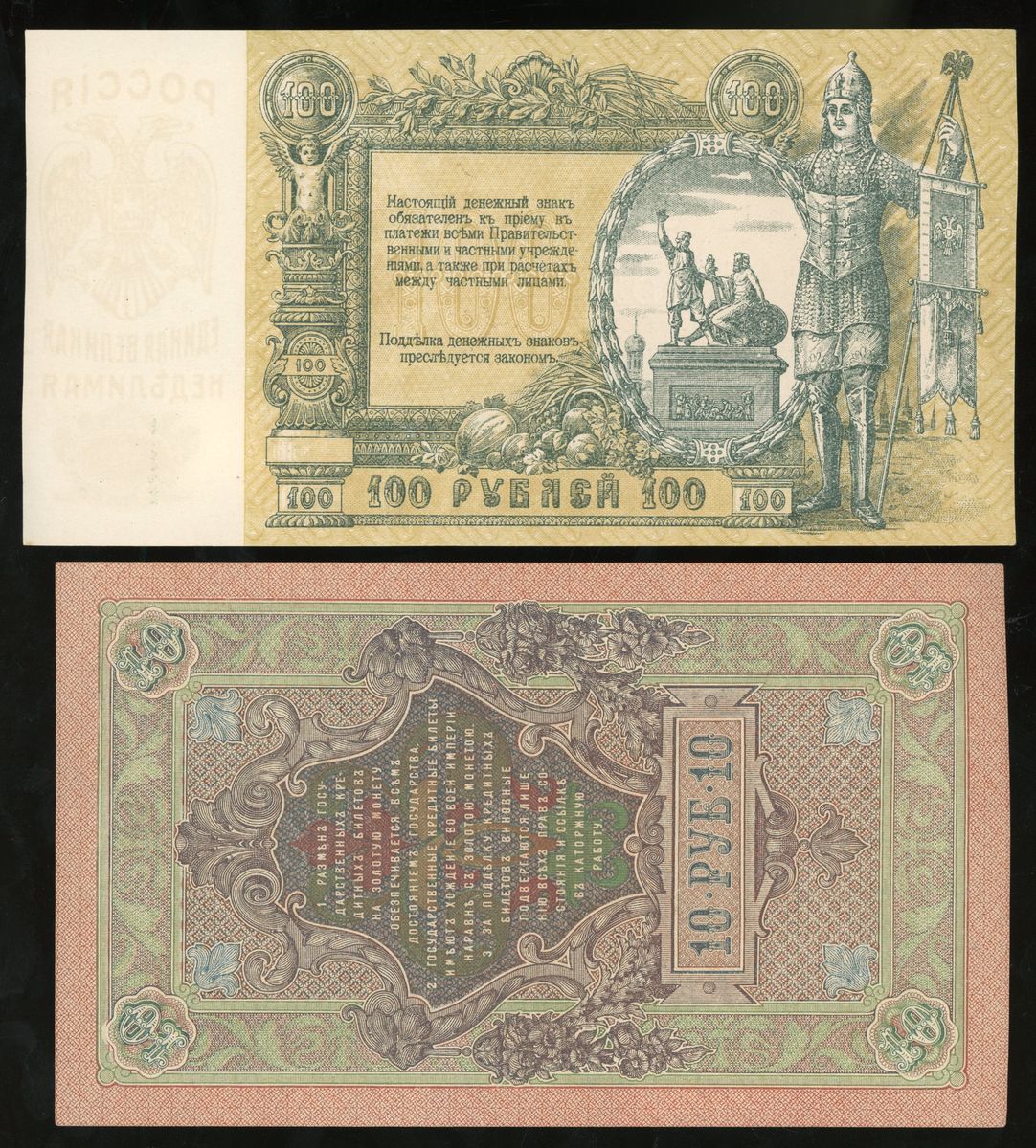 Russia, 10 rubles and 100 rubles, 1909 and 1919, (Pick 11c, S417a), Uncirculated (2)