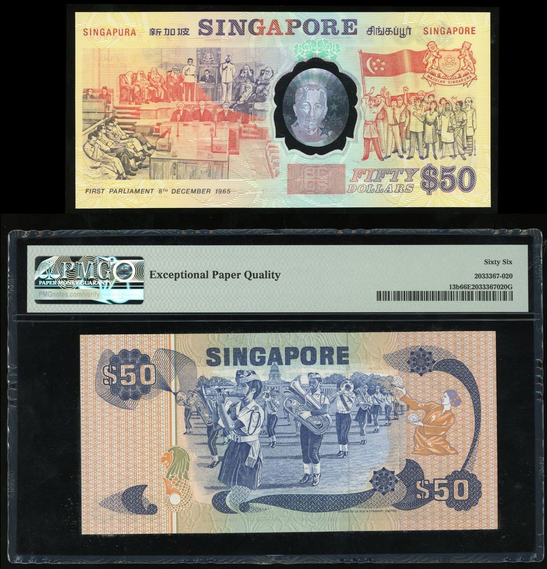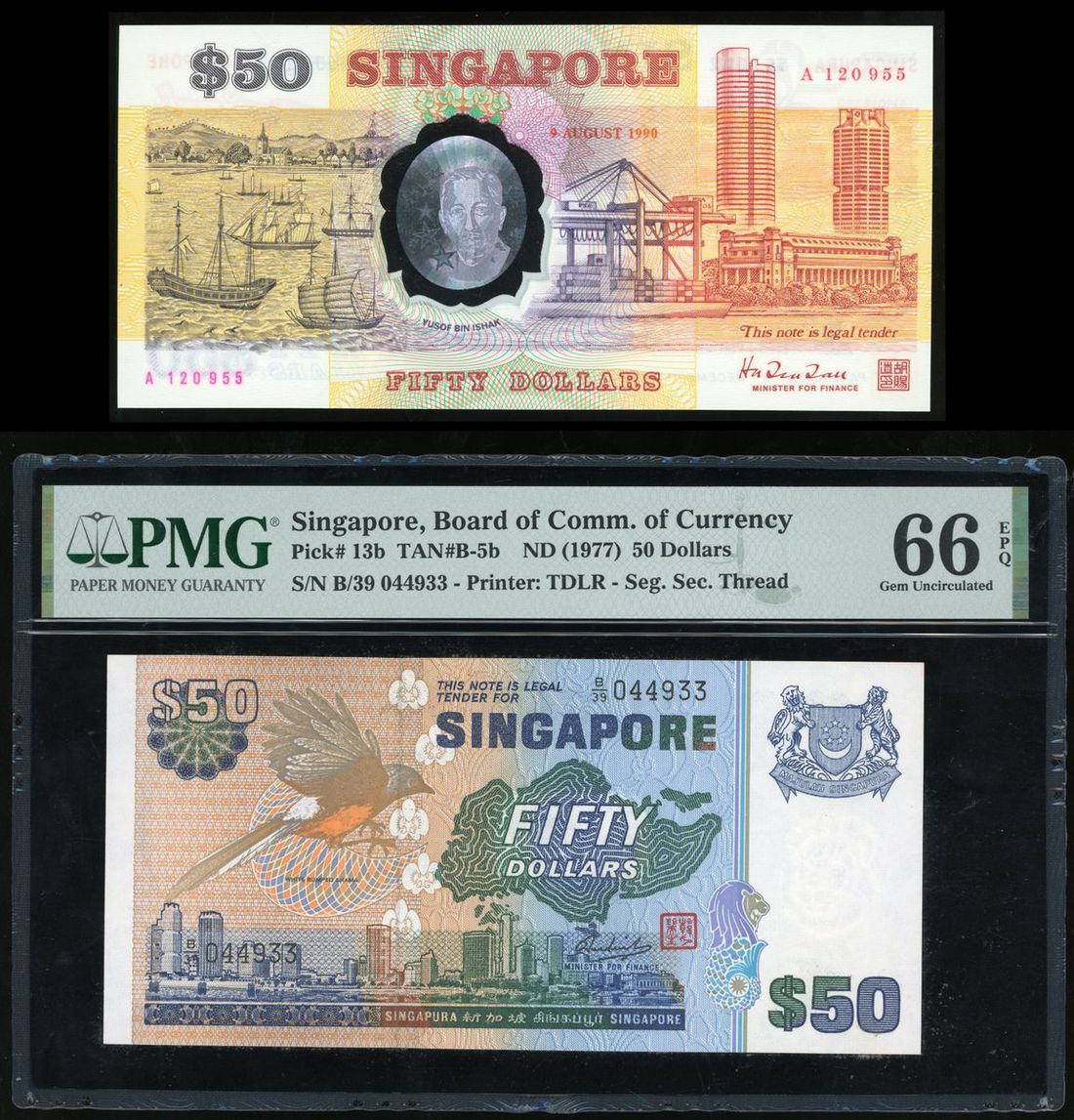 Singapore, a pair of $50, ND(1977), serial number B/39 044933, and 9.8.1990, serial number A 120955, (Pick 13b, 30), 1. PMG 66EPQ, 2.original packing UNC (2)