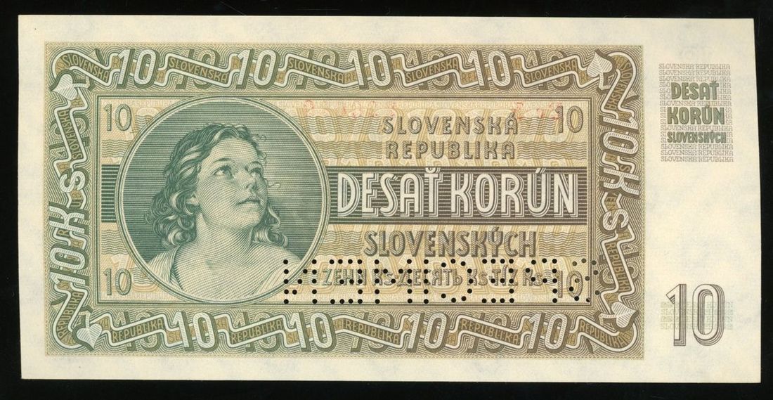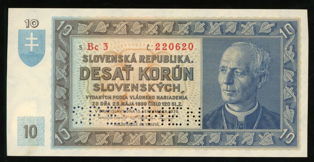 10 korún slovenských, 1939, serial number Bc3 220620, (Pick 4), Uncirculated