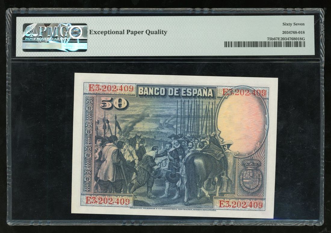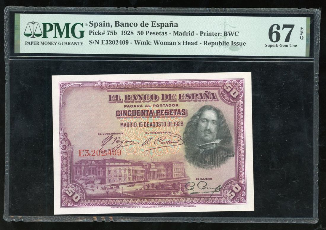 Spain, 50 pesetas, 1928, serial number E3202409, (Pick 75b), PMG 67EPQ