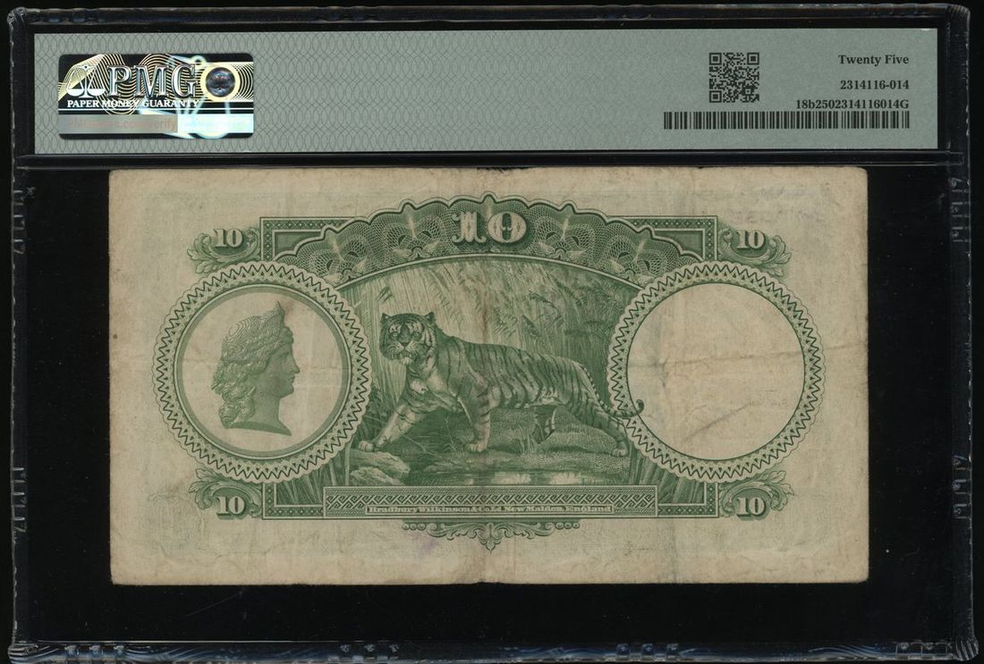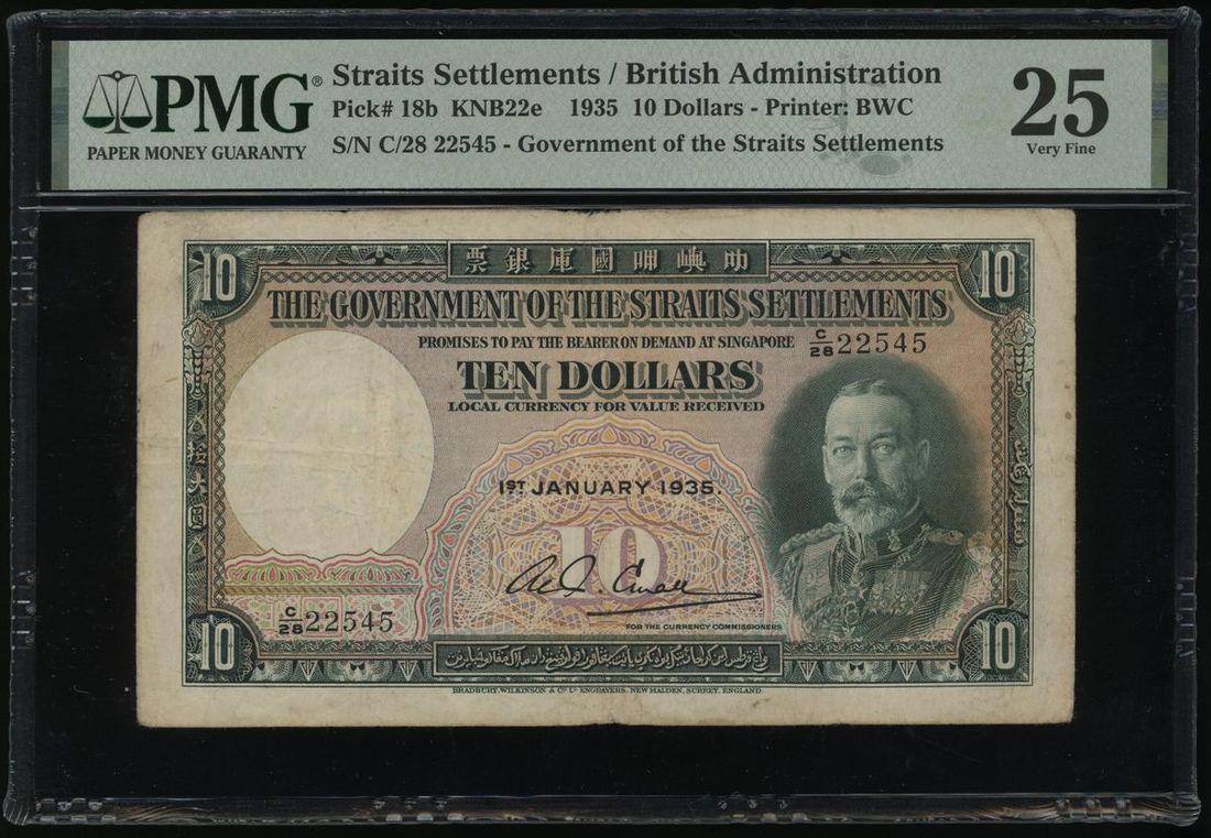 1935年海峽殖民地10元,編號 C/28 22545,PMG25