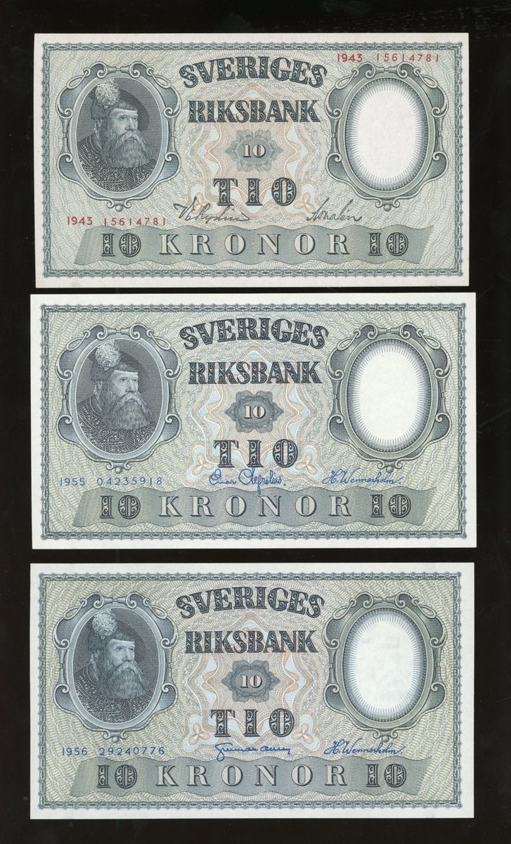Sveriges Riksbank, Sweden, a trio of 10 kronors, 1943, 1955, 1956, serial numbers 15614781, 04235918 and 29240776,