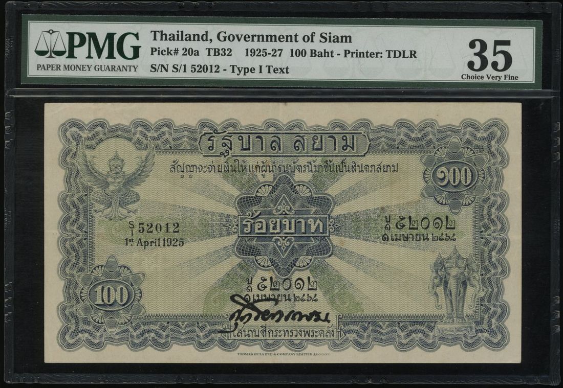 Government of Siam, 100 Baht, 1925-27, serial number S/1 52012 - Type I Text (Pick 20a) PMG 35, minor discoloration