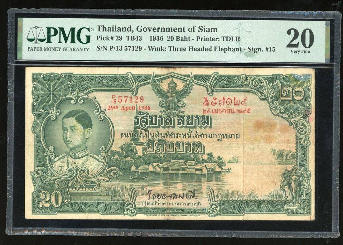 Government of Siam, Thailand, 20 Baht, 29.4.1936, serial number P/13 57129, (Pick 29), PMG 20