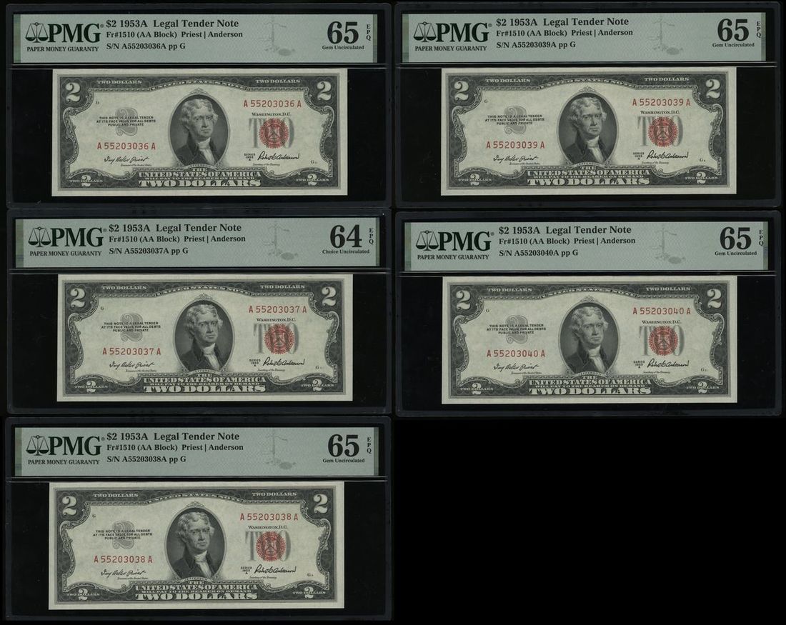 Legal Tender Note, United States of America, a consecutive group of 5x $2, 1953A, serial numbers A 55203036-40 A, signed by Priest and Anderson,