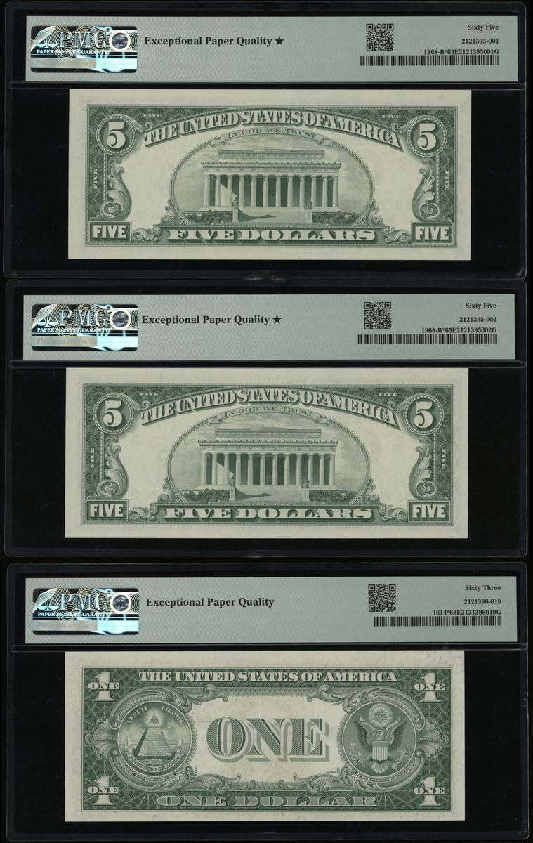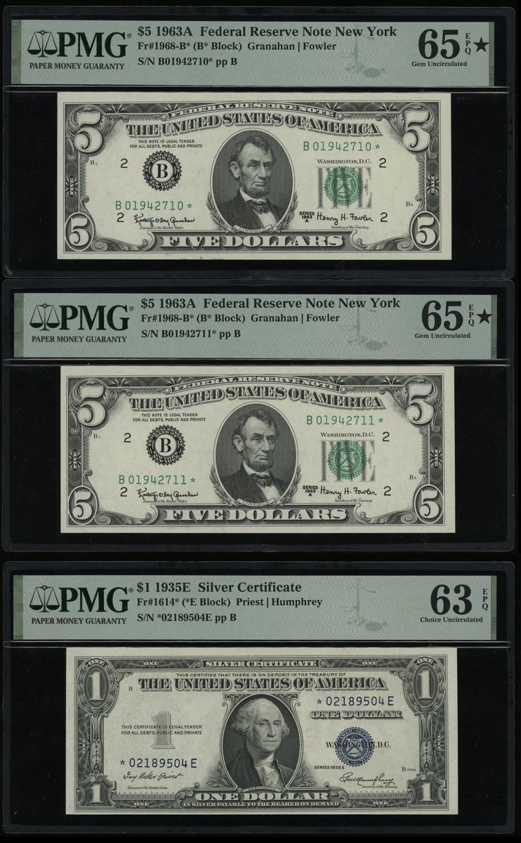 United States of America, a group of 3x, including: a consecutive pair of Federal Reserve Note New York replacement $5, 1963A, serial numbers B 01942710-11* pp B, signatures by Granahan and Fowler; Silver Certificate replacement $1, 1935E, serial number *02189504 E pp B, signatures by Priest and Humphrey;
