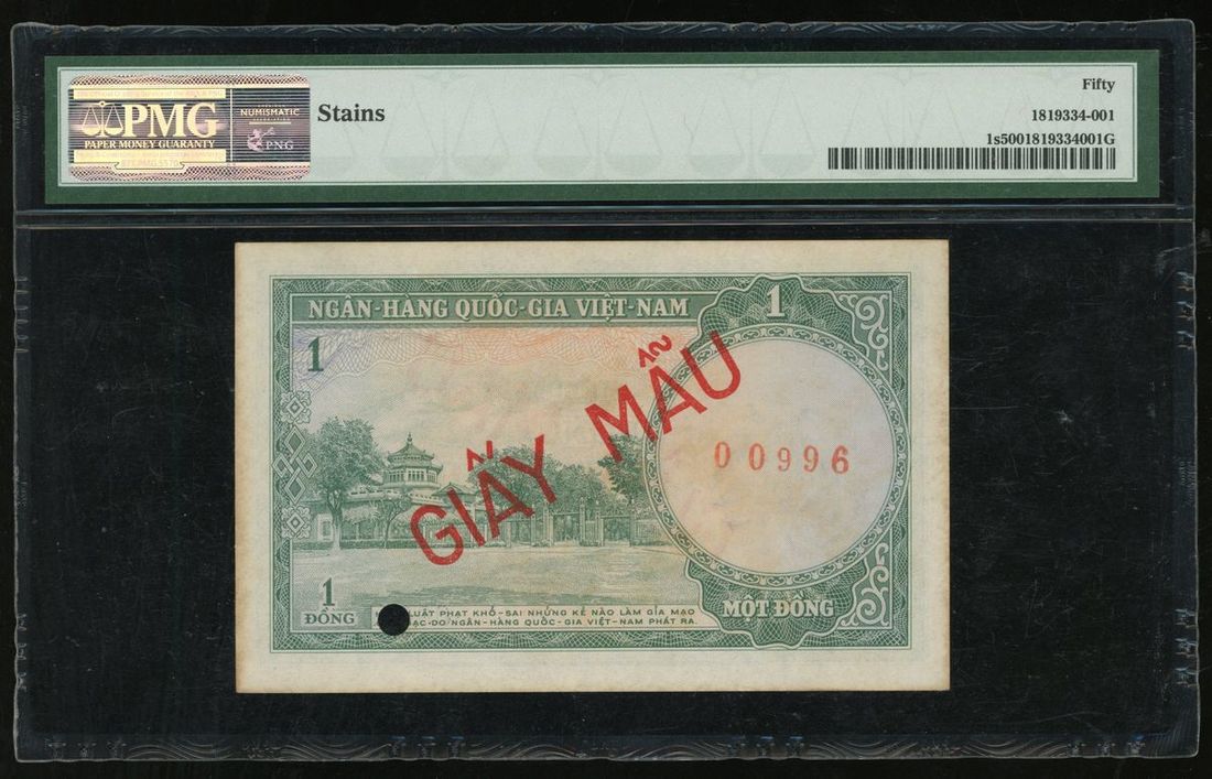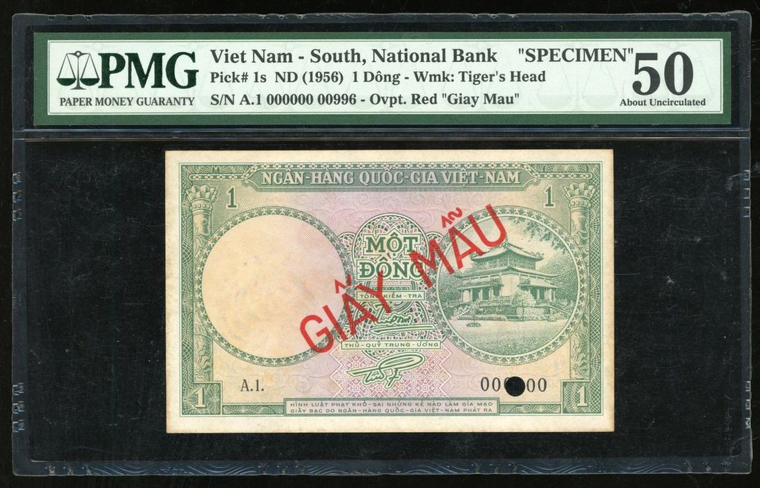 National Bank of Vietnam , specimen 1 dong, ND (1956), serial number A/1 000000 00996, (Pick 1s), PMG 50, stains