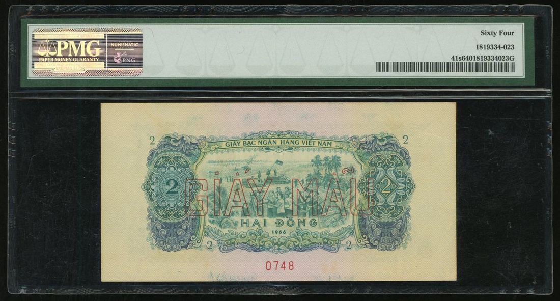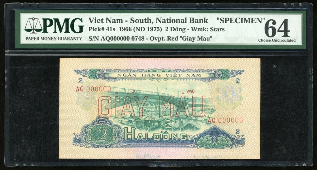 National Bank of Vietnam, specimen 2 dong, 1966 ND (1975), serial number AQ 000000 0748, (Pick 41s), PMG 64