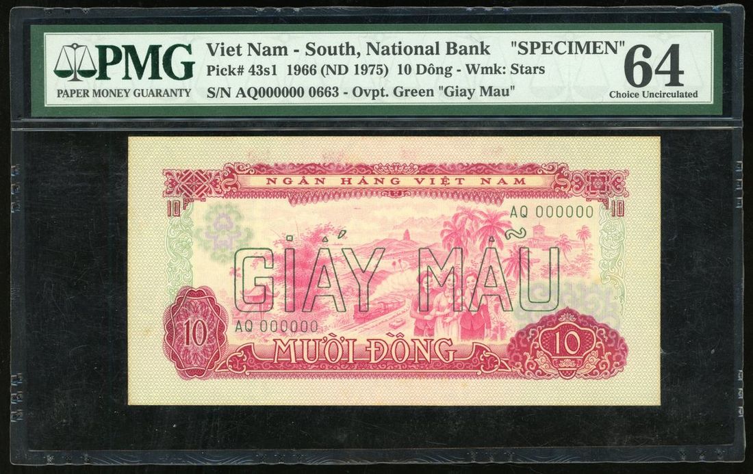 National Bank of Vietnam, specimen 10 dong, 1966 ND (1975), serial number AQ 000000 0663, (Pick 43s1), PMG 64, minor stains