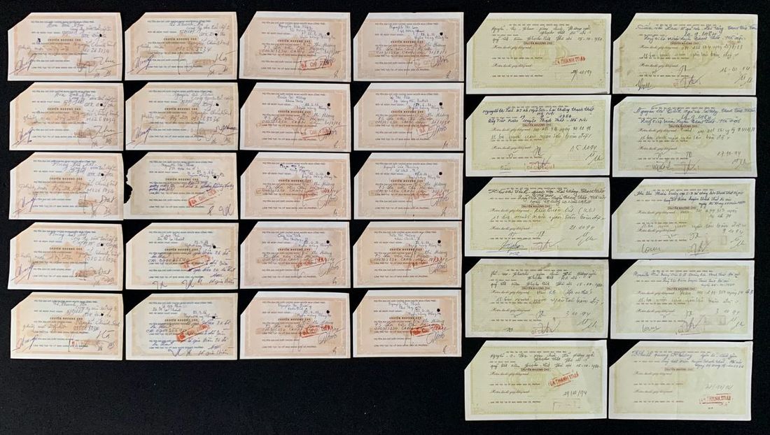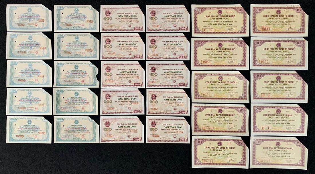 Vietnam, National Construction Bonds, a group of 28x, including 100 dong (10), 500 dong (9), 1000 dong (9), 1984-88, all with cut upper right corner, some with punched holes. Very fine (28)