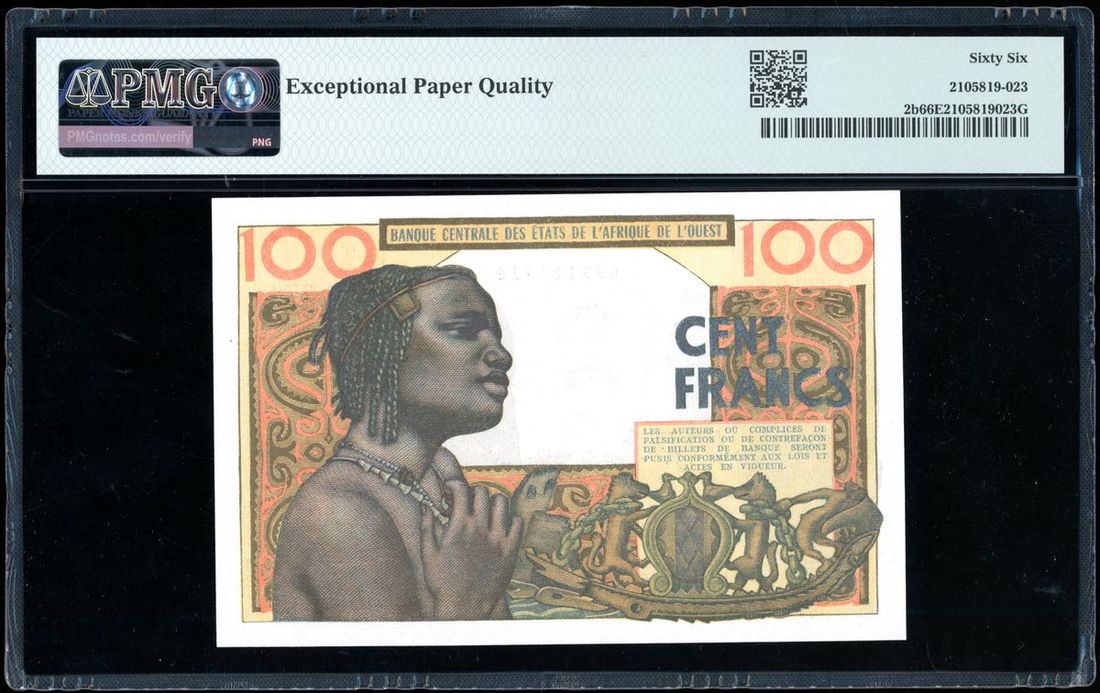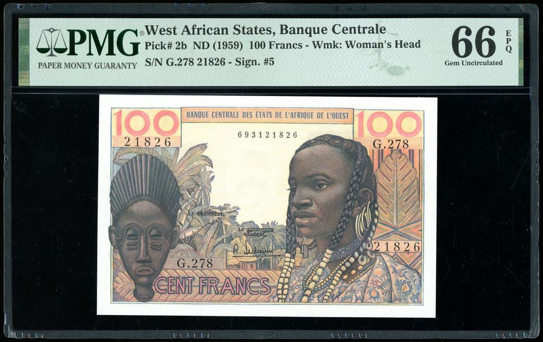 West African States, 100 francs, ND (1959), serial number G.278 21826, (Pick 2b), PMG 66EPQ