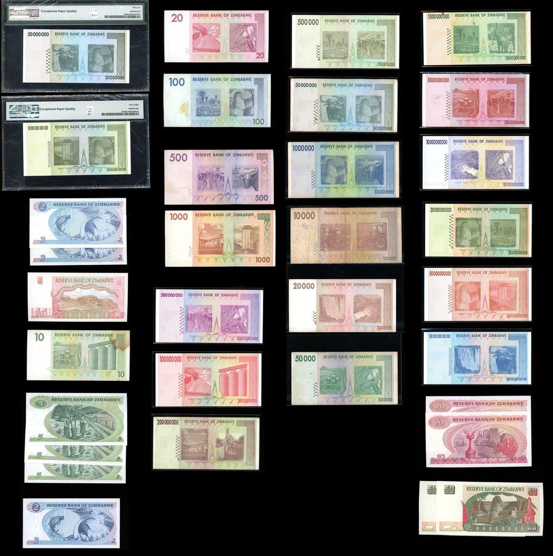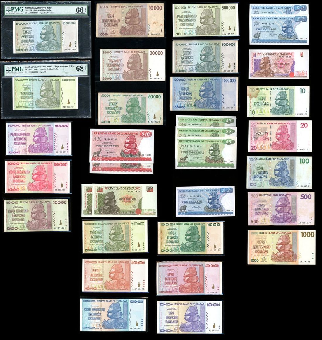 Reserve Bank of Zimbabwe, a group of 33x, including 2008 $100 trillion, $50 million and $10 trillion, (various picks), mixed condition, $100 trillion About Uncirculated, $10 trillion and $50 million both graded PMG 68EPQ