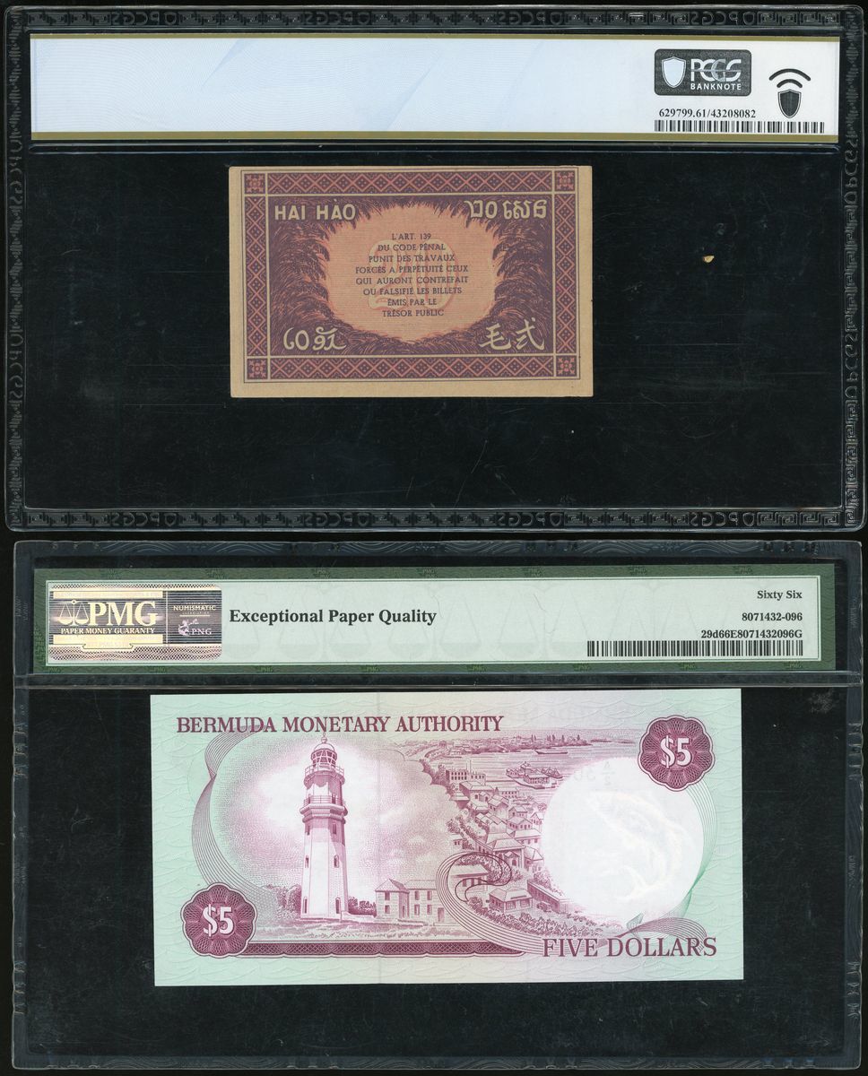 World Banknotes, a pair, including Bermuda Government $5 1988 and French Indo China 20 cents 1942, PMG 66EPQ and PCGS 61PPQ respectively (2).