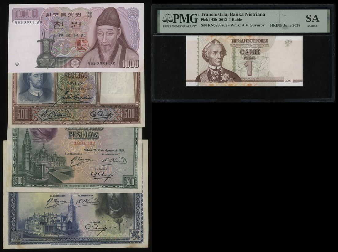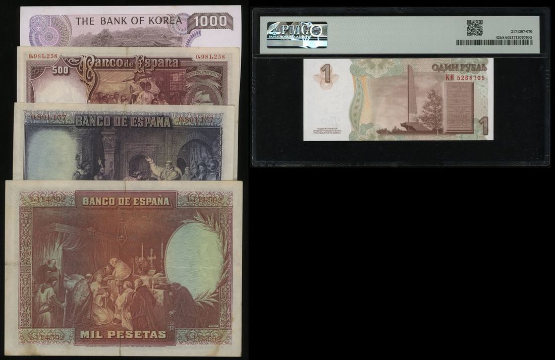 (Pick 47, 84, 77, 78, 42b), 1000 won and 1 ruble Uncirculated, 1000 pesetas Very Fine, the rest Extremely Fine (5)