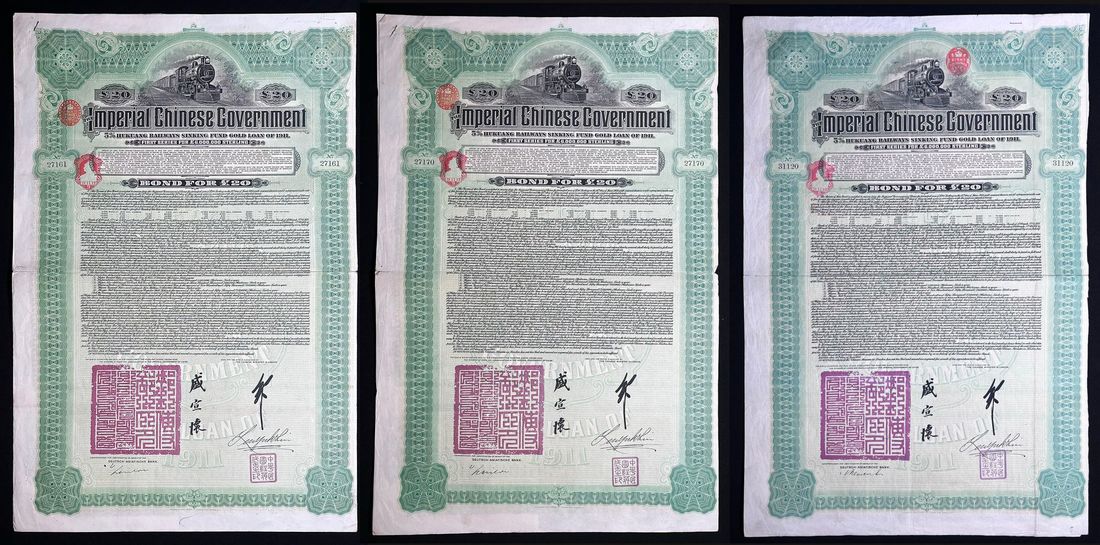 Chinese Government, 5% Hukuang Railways Sinking Fund Gold Loan, 1911, £20 (3), issued by Deutsch-Asiatische Bank, serial number 27161, 27170, 31120,