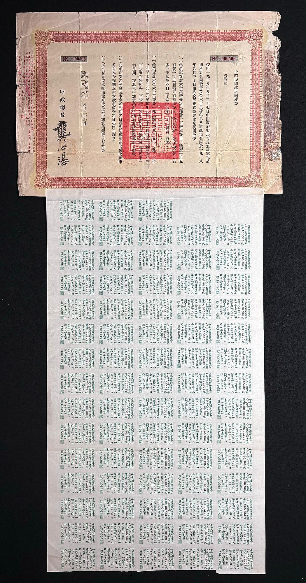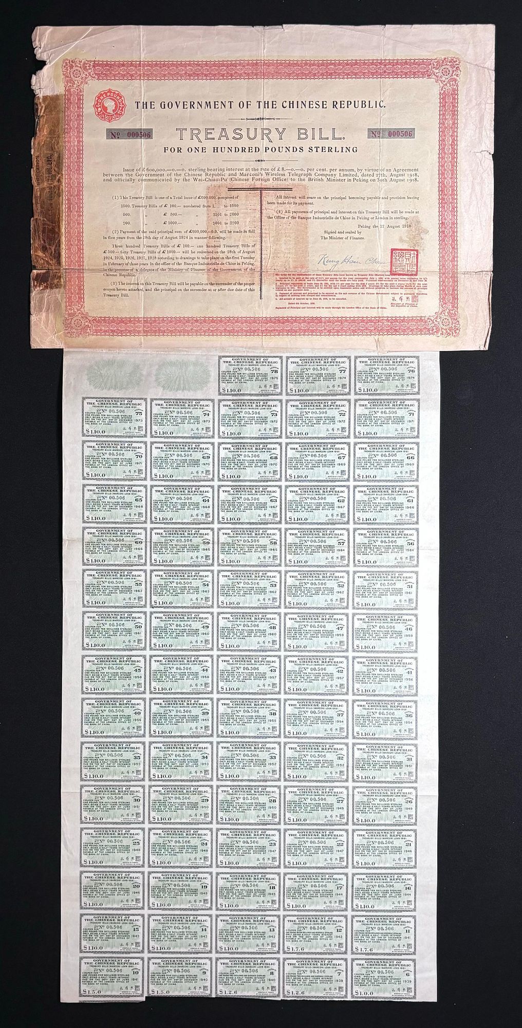 Government of Chinese Republic, 8% Treasury Bill "Marconi" Loan, £100, 1918, serial number 000506, with tape at left, coupons reattached, fine