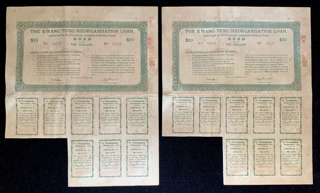 Kwang Tung Province 8% Organisation Loan, China, 1921, consecutive bond for 10 dollars, serial numbers 73775/76, with coupons, stained, splits at margin from folding, very fine (2)