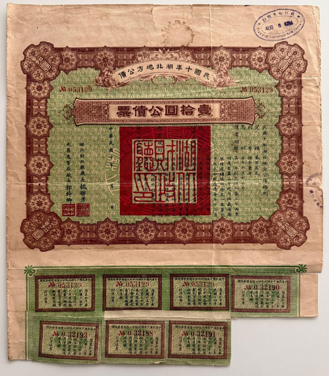 Hupei Province Year 10 Regional Share, China, 10 yuan share, 1922, serial number 053129, jointly issued by Wuchang Mint and Hupei Province Treasury,