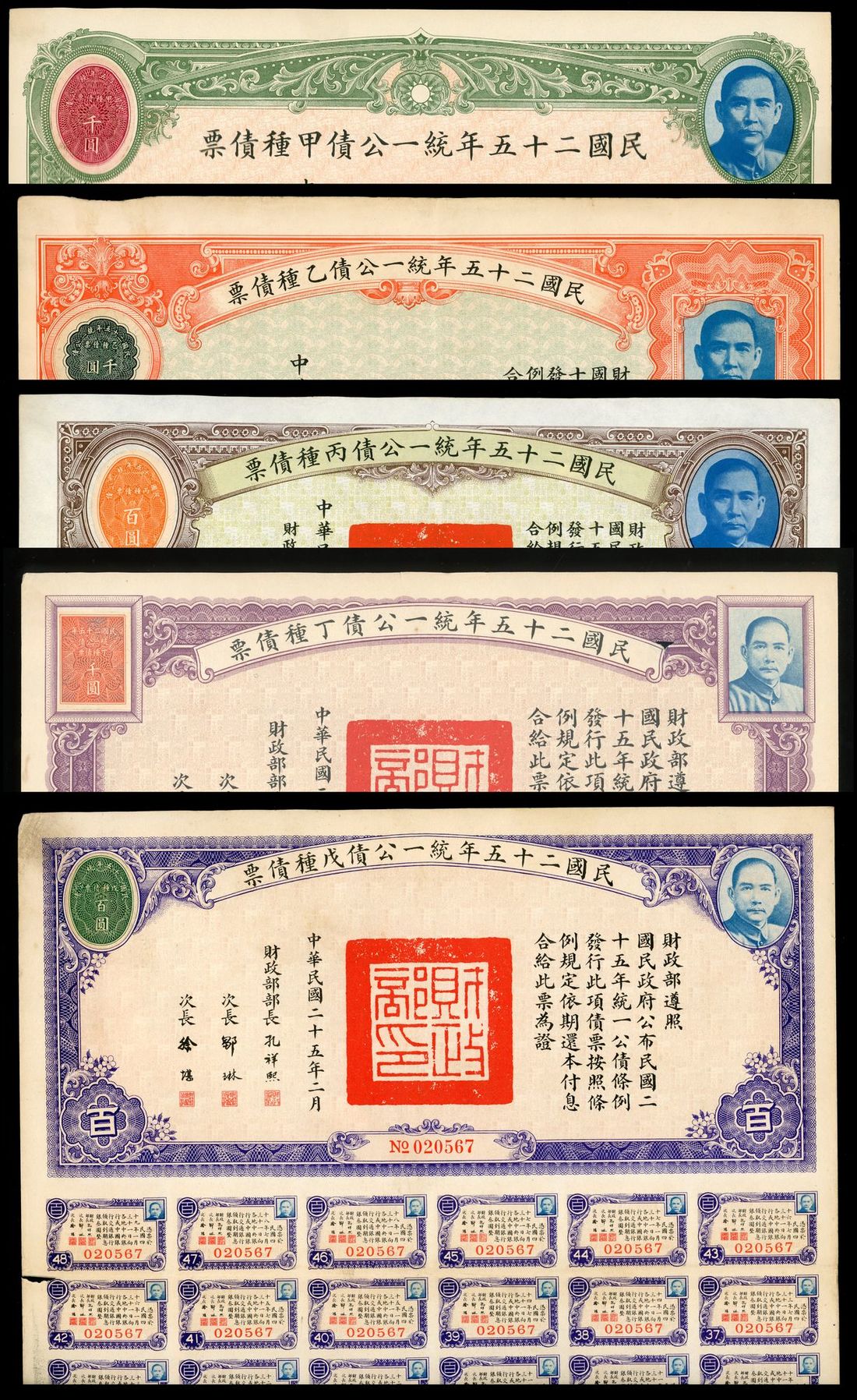 China Year 25 (1936) United National Loan, a group of 5x, including, 1st series 1000 yuan, 2nd series 1000 yuan, 3rd series 100 yuan, 4th series 1000 yuan, 5th series 100 yuan,