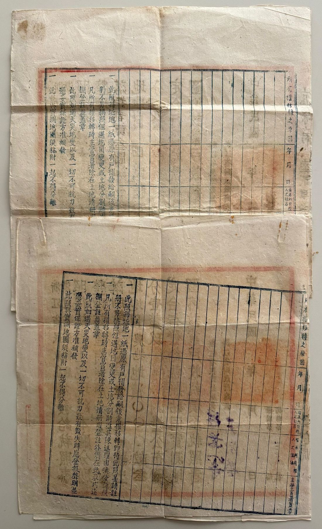 China, Zhejiang Province, Hangzhou, Land Registration, Republic Era, a pair, certificate with land lot map, one with revenue stamp, with handling very fine (2)