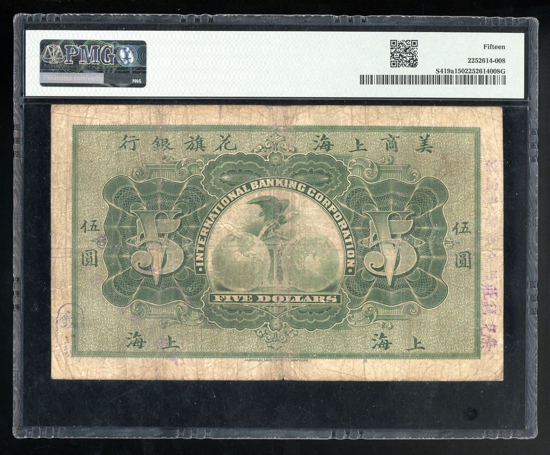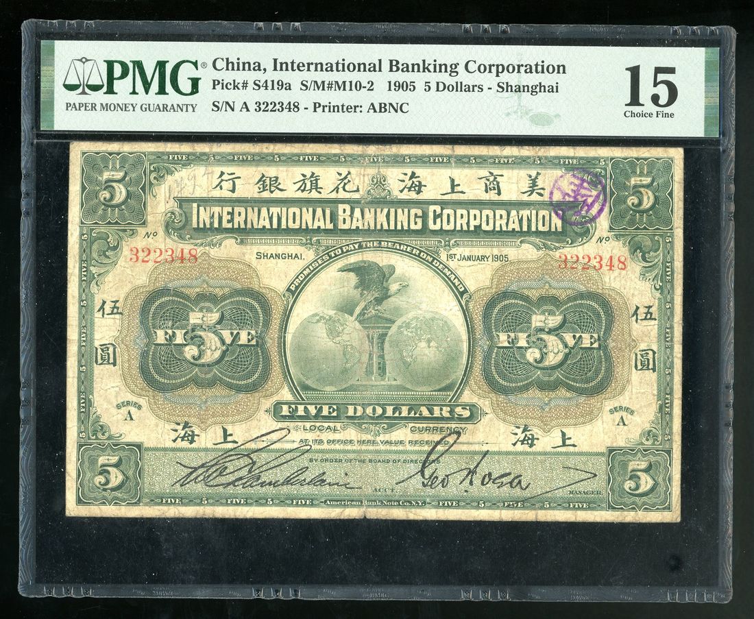 International Banking Corporation, $5, 1905, Shanghai, serial number A322348, (Pick S419a), PMG 15, choice fine.