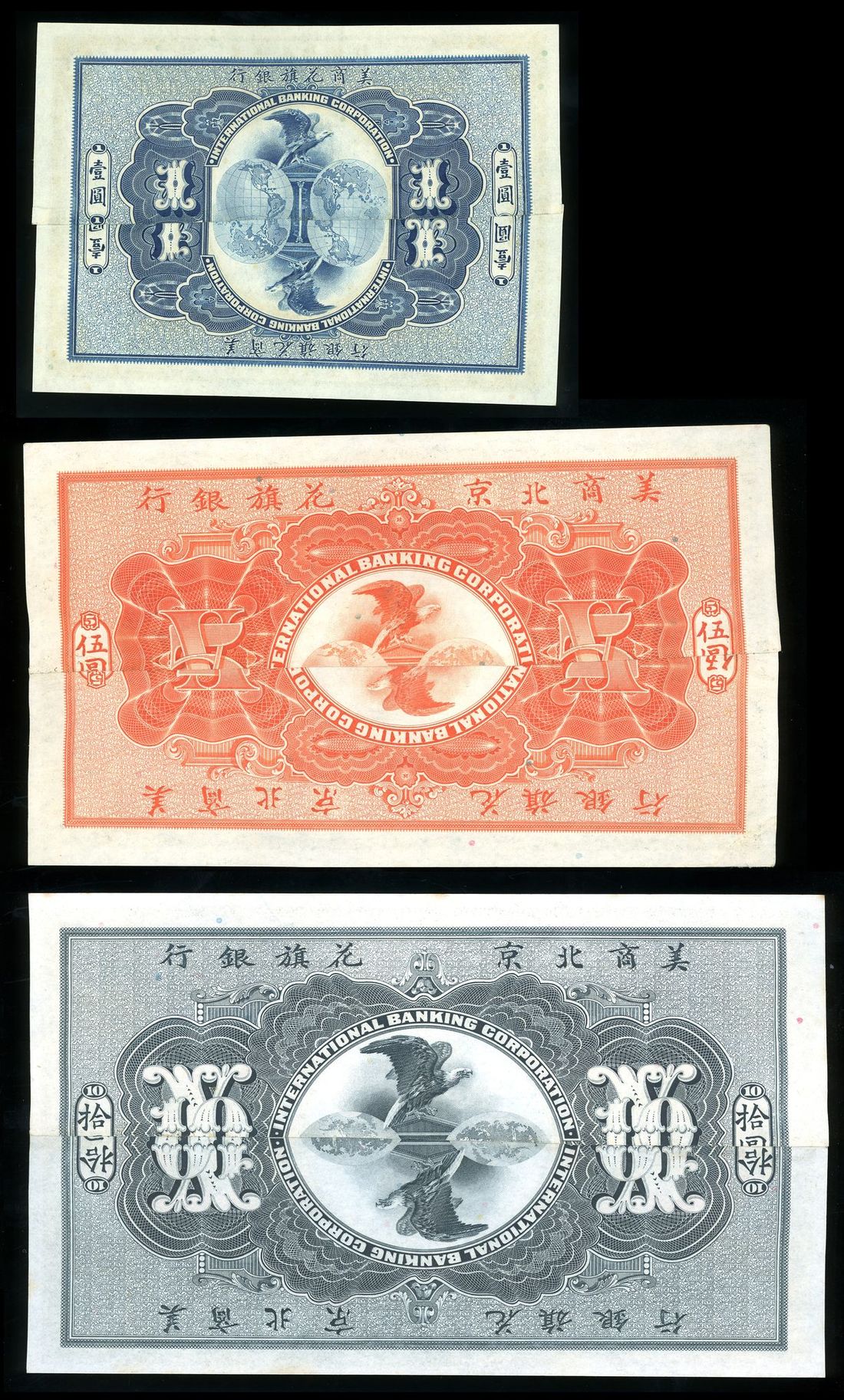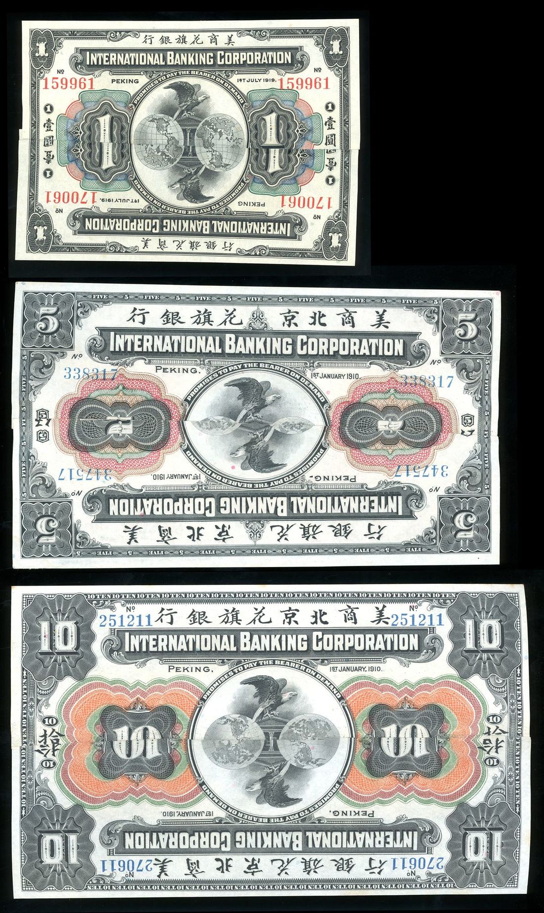 International Banking Corporation, China, a group of 3x, cancelled $1, $5 and $10, Peking, 1910-19, all cut cancelled then reattached, balance about uncirculated (3)