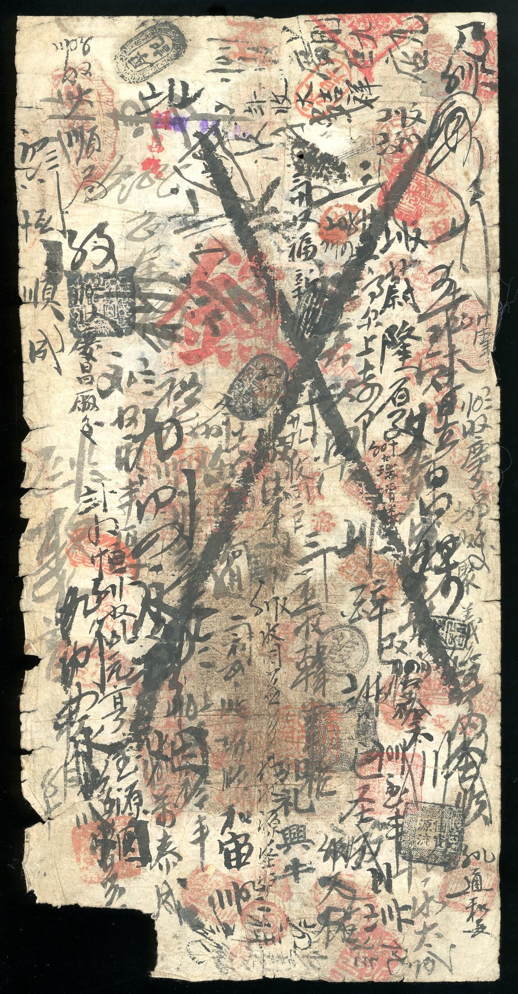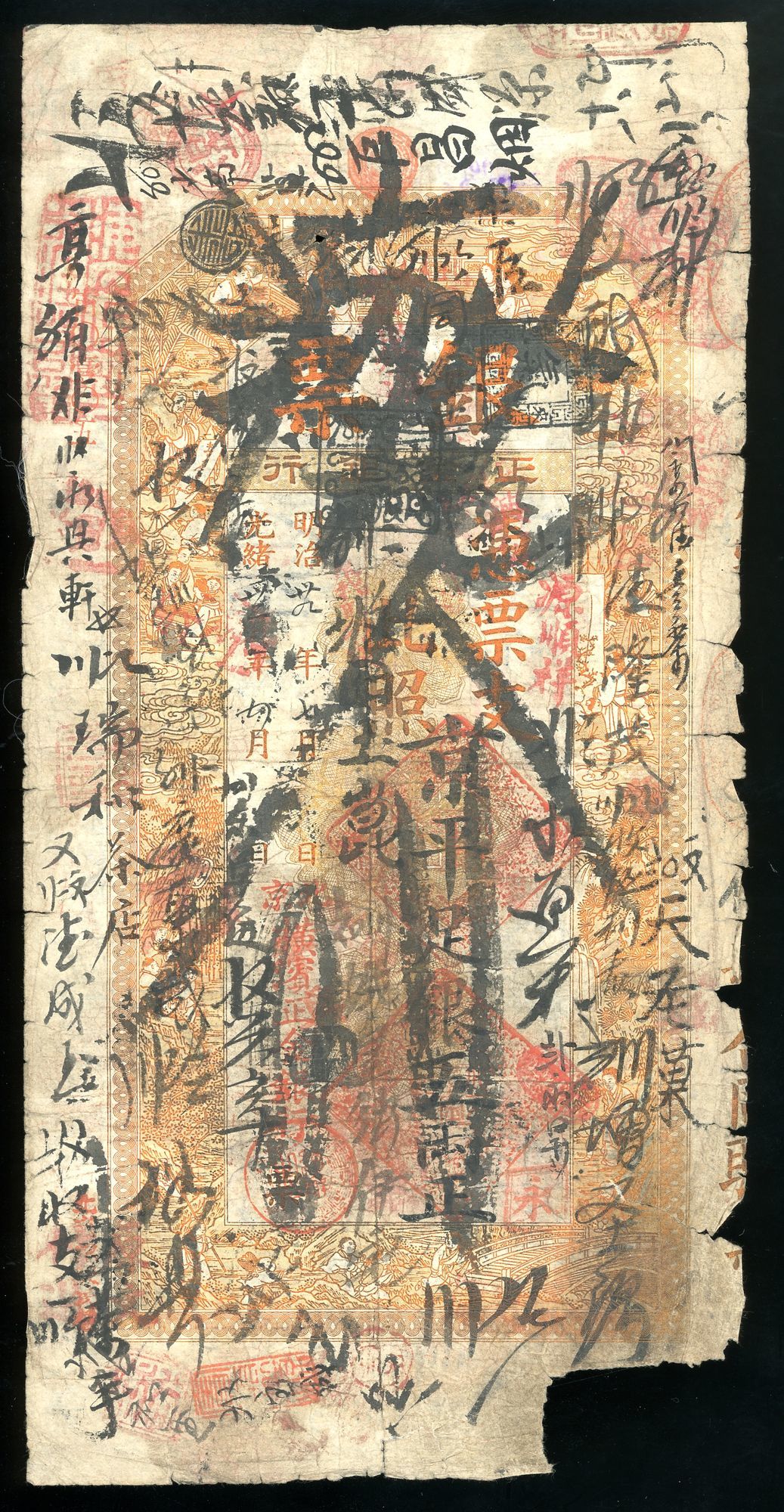 Yokohama Specie Bank, China, 5 taels, Guangxu Year, ink cancelled, annotation throughout, lower right corner missing, good