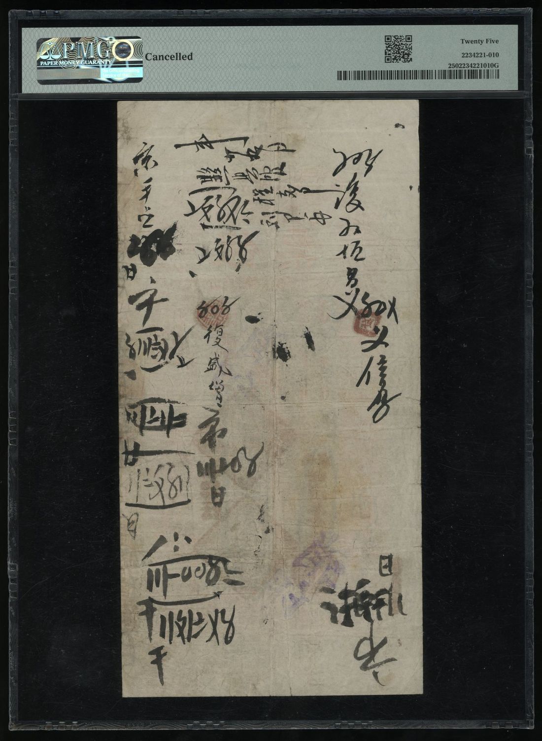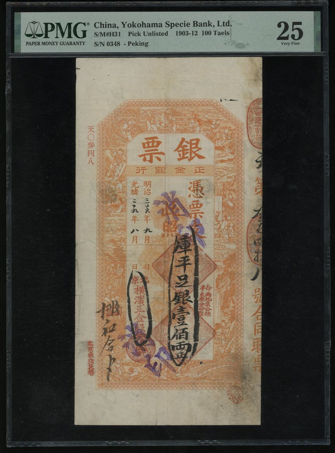 Yokohama Specie Bank, China, 100 taels, Guangxu Year 29 (1903), Peking, serial number 0348, PMG 25, cancelled