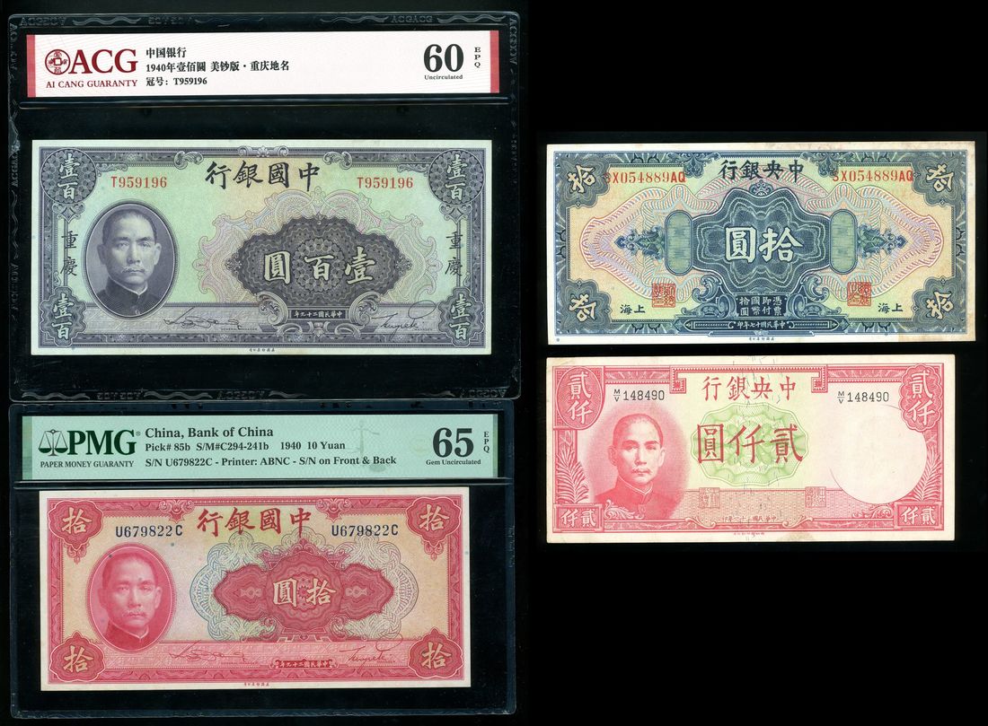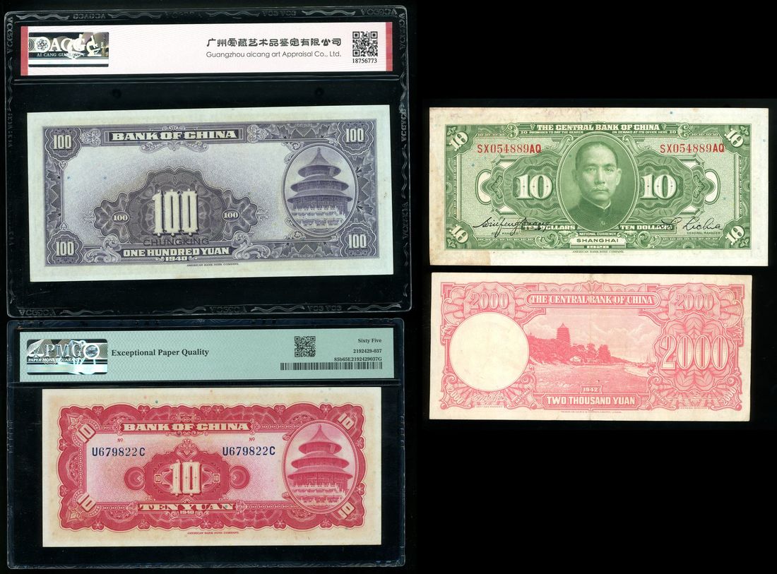 China, a group of 4x, including, -Bank of China, 10 yuan, 1940, PMG 65EPQ,