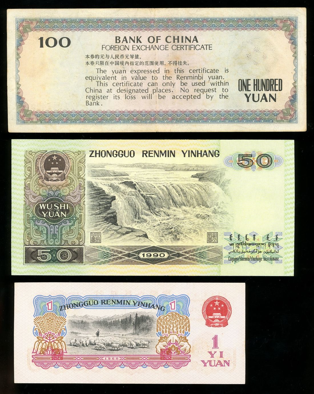 People's Bank of China, a lot of 1 yuan and 50 yuan, 1960 and 1990, together with a foreign exchange certificate 100 yuan, 1979, serial number VI X98640629, AX35806773, ZJ911420, (Pick 874, 888b, 1979), the 1 yuan extremely fine, 50 yuan uncirculated, 100 yuan very fine.(3)