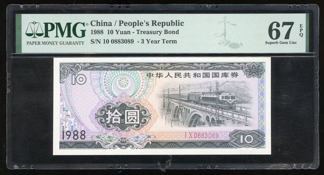 People's Bank of China, Treasury Bond, 10 yuan, 1988, serial number IX 0883089, PMG 67EPQ
