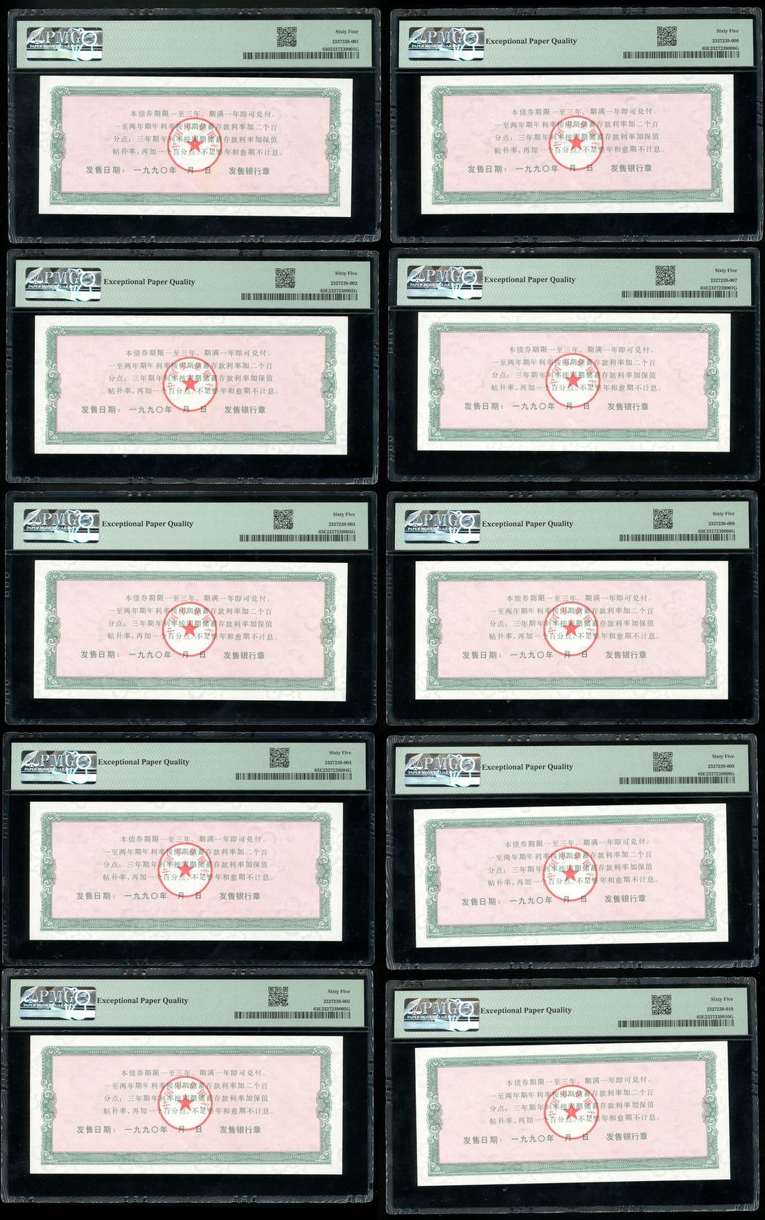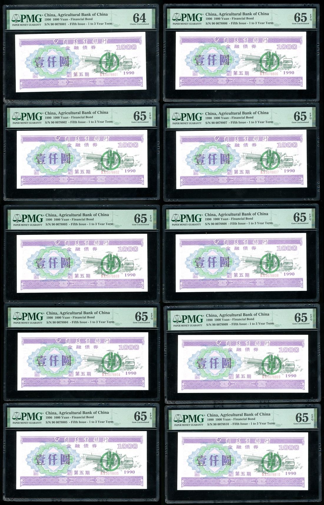 Agricultural Bank of China, 5th Issue Financial Bond, consecutive 1000 yuan (10), 1990, serial numbers IX X 0078801-10, 9x PMG 65EPQ, 1x PMG 64 (10)