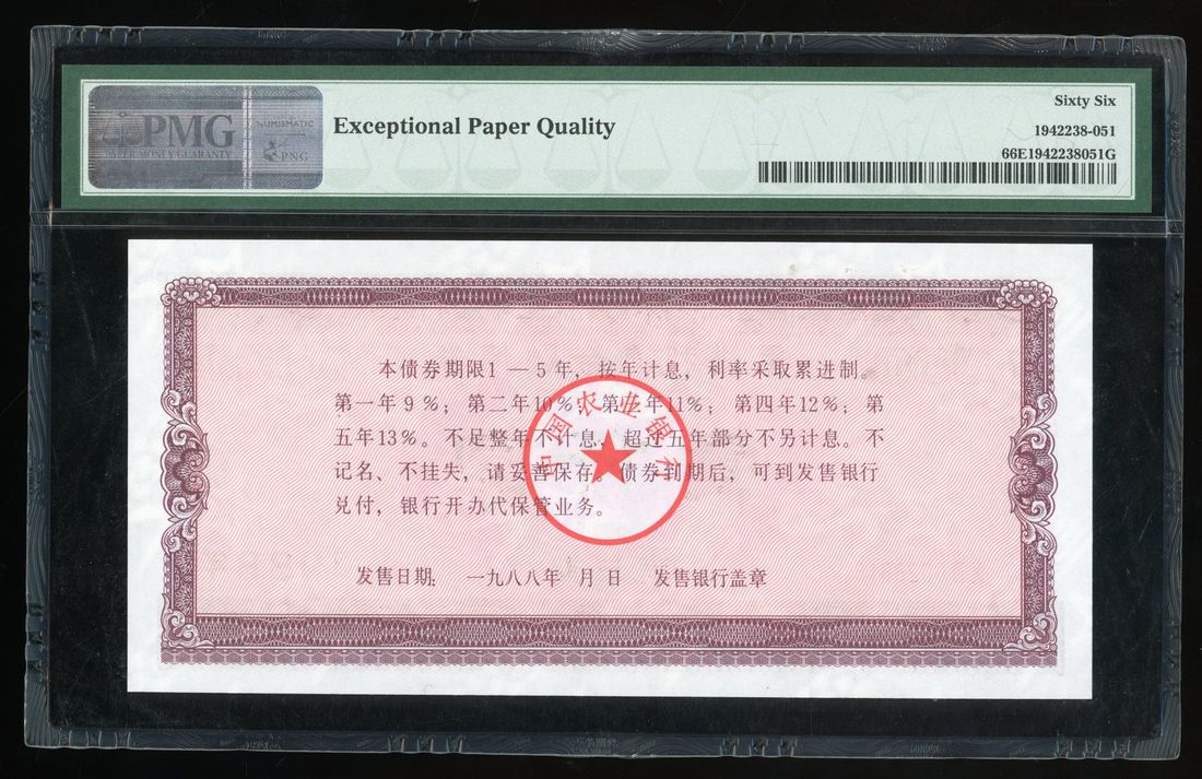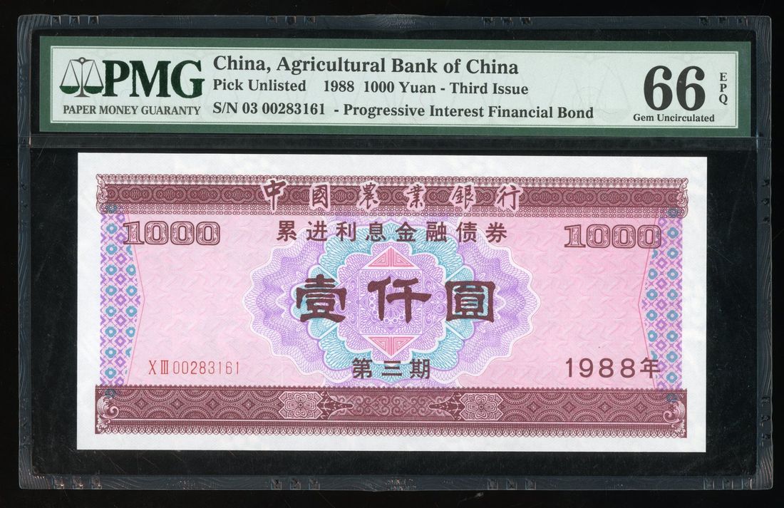 Agricultural Bank of China, 3rd Issue, Progressive Interest Financial Bond, 1000 yuan, 1998, serial number X III 00283161, PMG 66EPQ