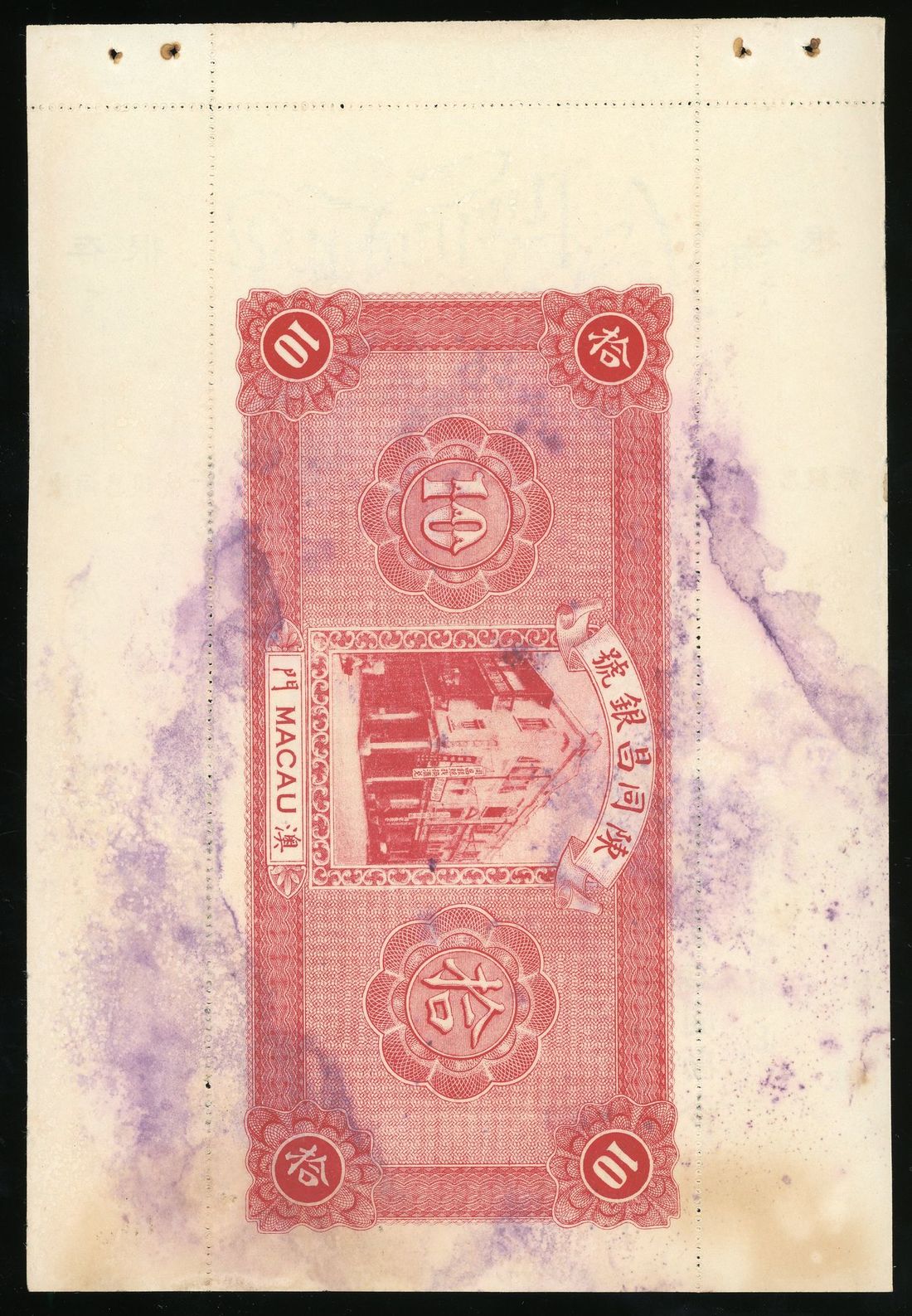 Macau, Chan Tung Cheng Bank, 10 silver yuan, 1934, remainder, vertical format, with counterfoil at left and right,