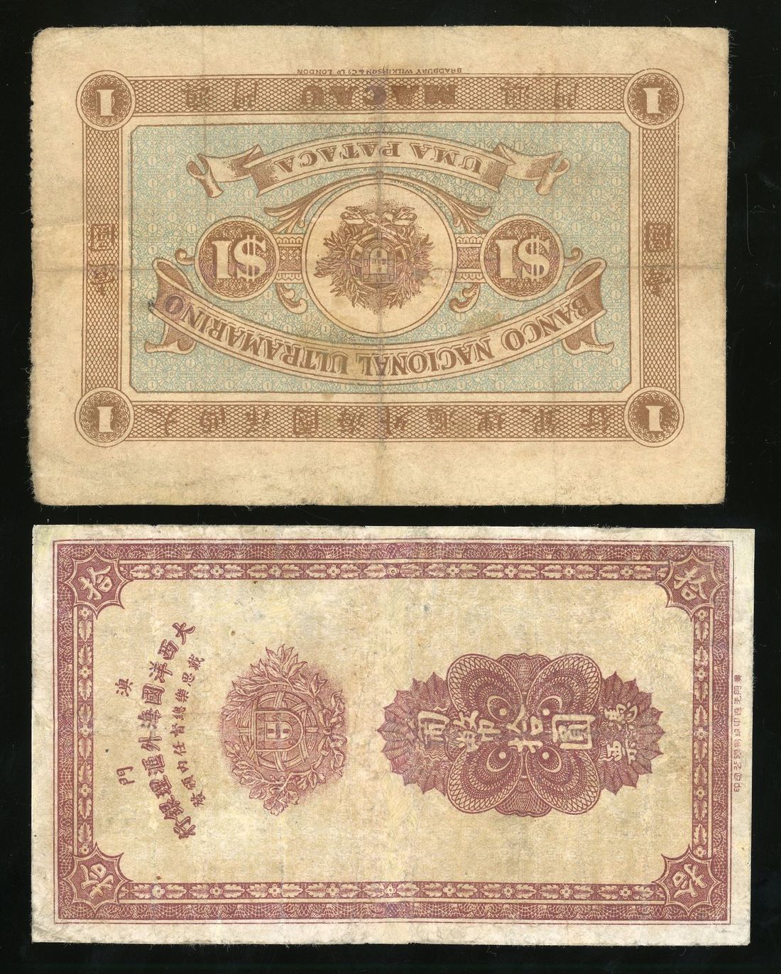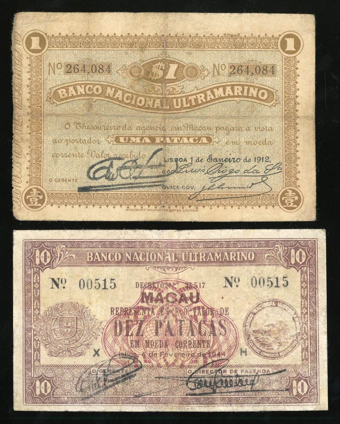 Banco Nacional Ultramarino, Macau, 1 and 10 patacas, 1912 and 1944 respectively, serial number 264084, 00515, (Pick 7, 23), fine and about fine.(2) Viewing highly recommended, sold as is, no return