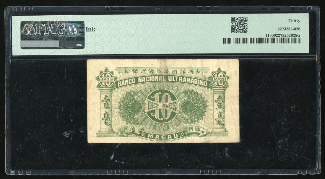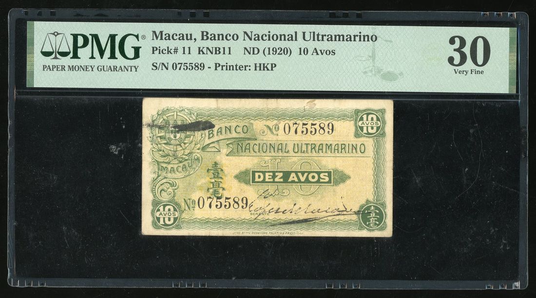 Banco Nacional Ultramarino, Macau, 10 avos, ND (1920), serial number 075589, (Pick 11), PMG 30, Ink