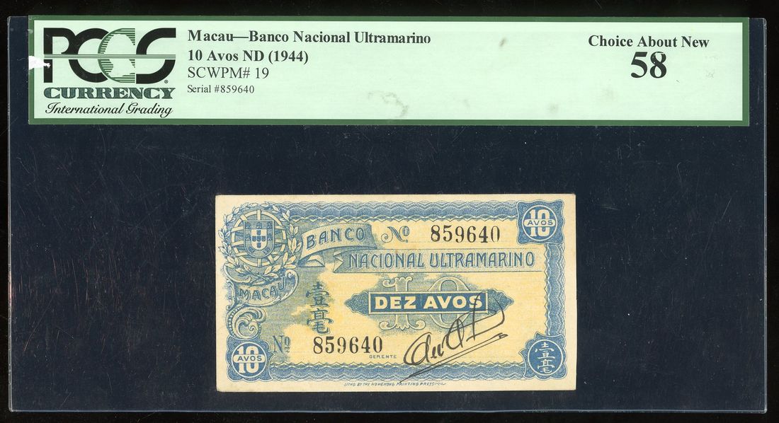 Banco Nacional Ultramarino, Macau, 10 avos, ND (1944), serial numbers 859640 (Pick# 19),