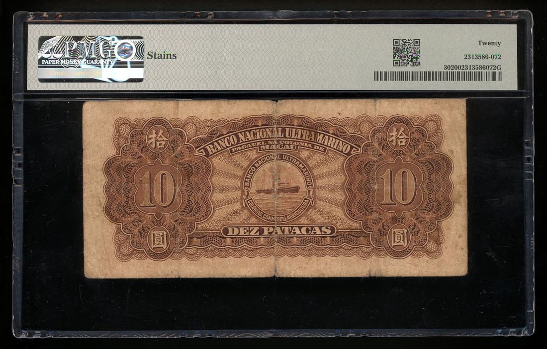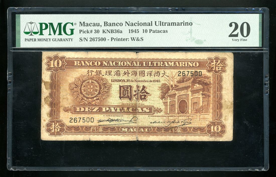Banco Nacional Ultramarino, Macau, 10 patacas, 1945, serial number 267500, (Pick 30), PMG 20, stains.