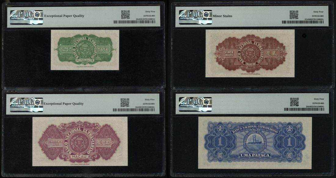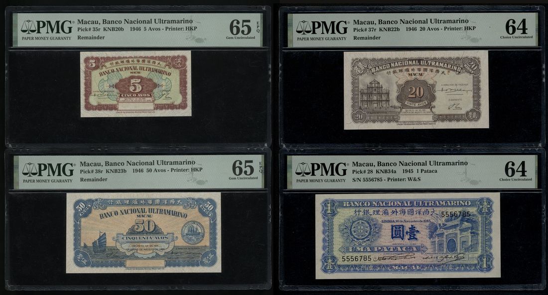 Banco Nacional Ultramarino, Macau, a group of 4x, including: - 5 avos remainder, 1946, PMG 65EPQ