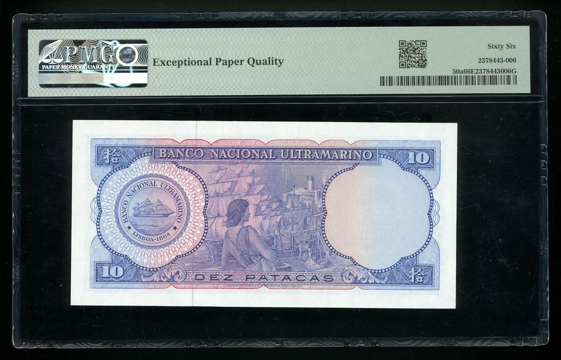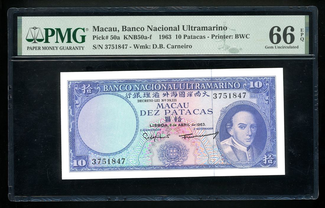 Banco Nacional Ultramarino, Macau, 10 patacas, 1963, serial number 3751847, (Pick 50a), PMG 66EPQ