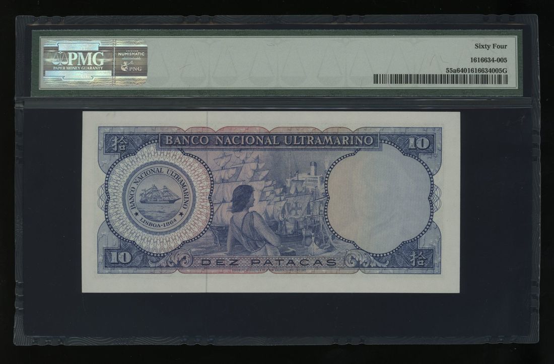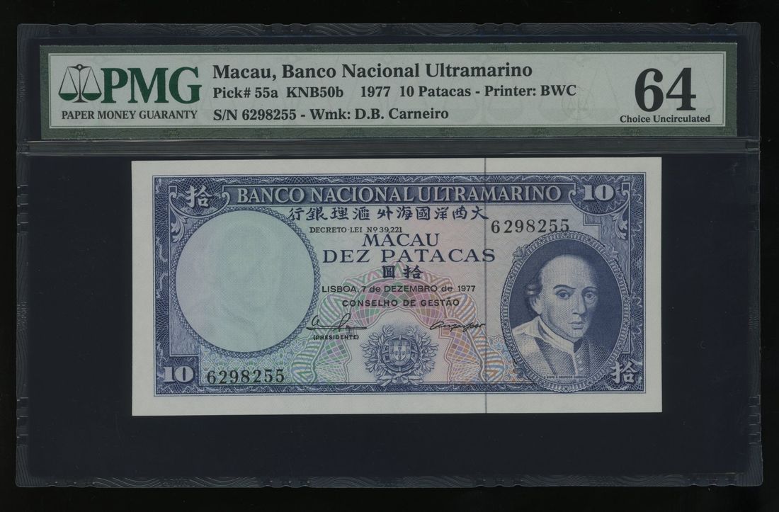 Banco Nacional Ultramarino, Macau, 10 patacas, 1977, serial number 6298255, (Pick 55a), PMG 64.