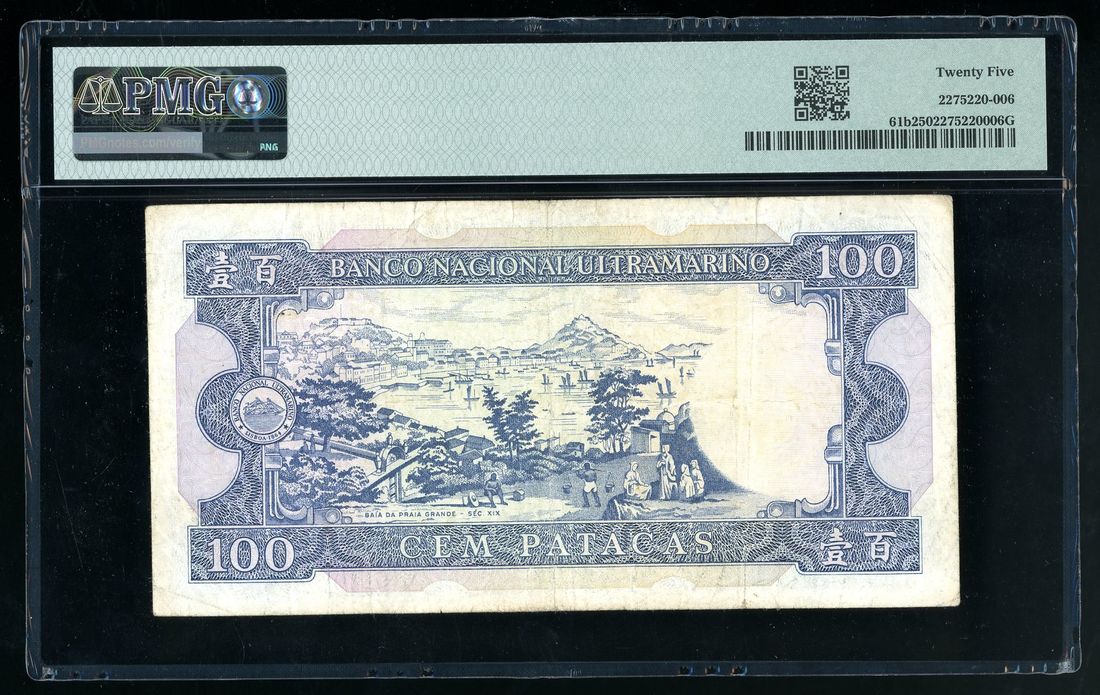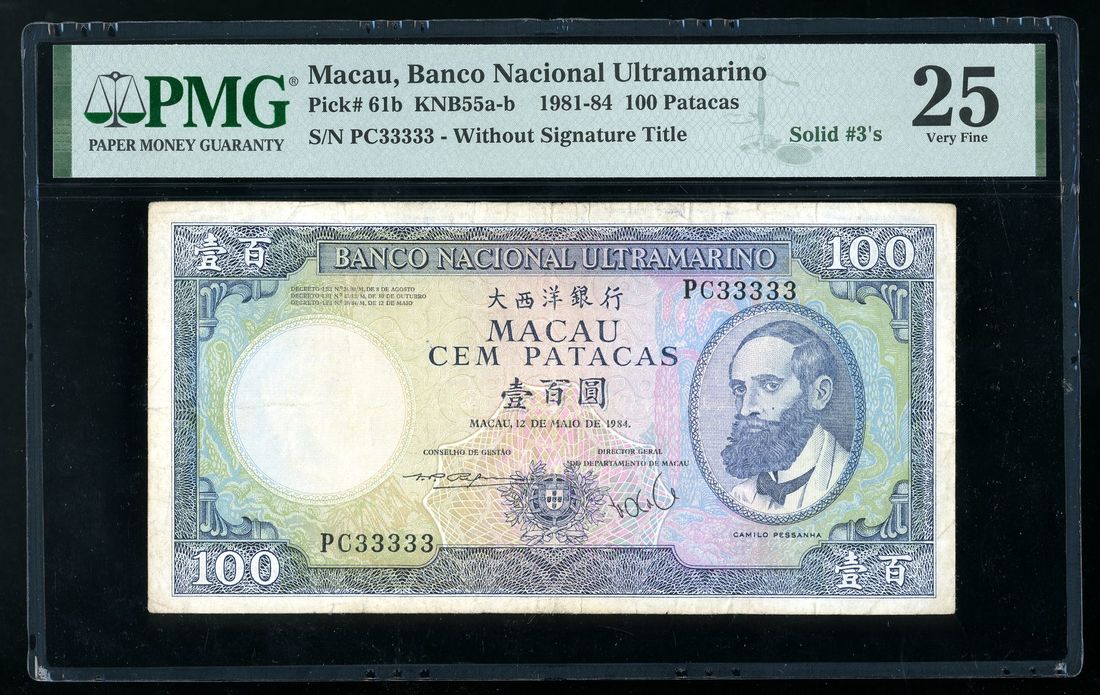 Banco Nacional Ultramarino, Macau, 100 patacas, 1984, solid serial number PC 33333, (Pick 61b), PMG 25