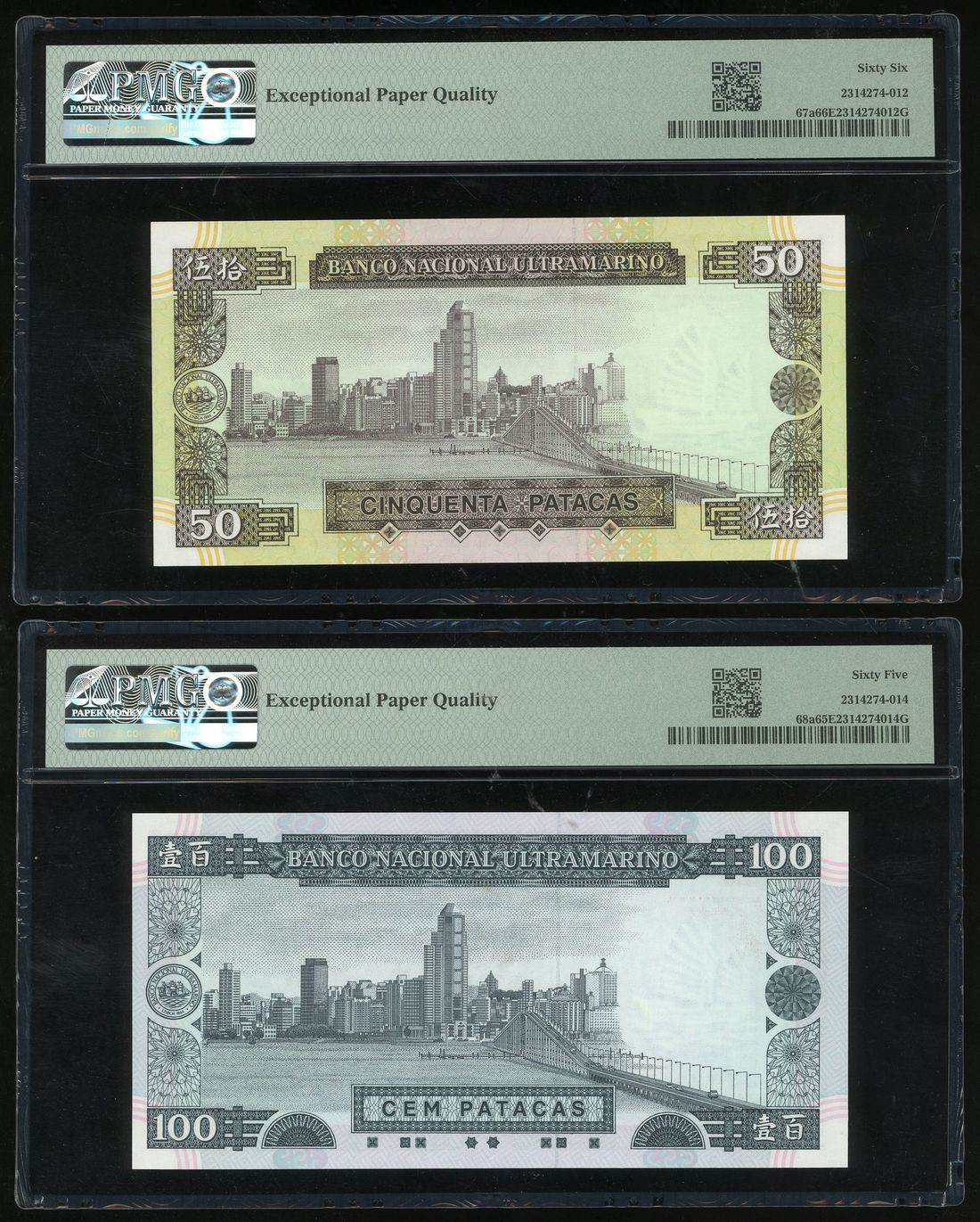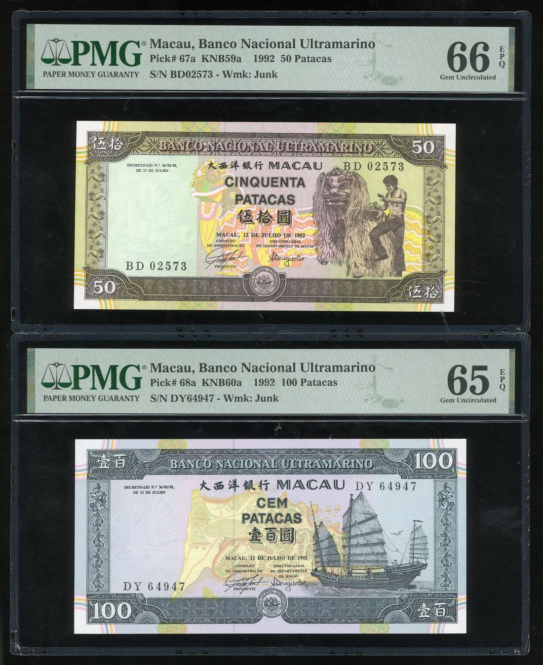 Banco Nacional Ultramarino, Macau, a pair, 1992, including 50 and 100 patacas, (Pick 67a, 68a), PMG 66EPQ and 65EPQ respectively (2)