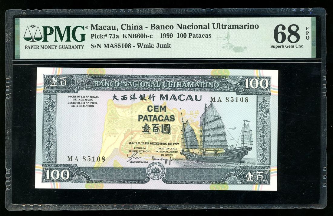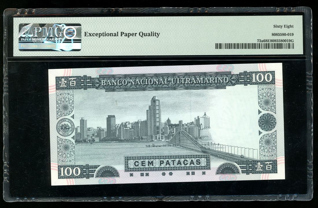 Banco Nacional Ultramarino, Macau, 100 patacas, 20.12.1999, serial number MA85108, (Pick 73a), PMG 68EPQ. PMG 2nd highest grade with only 6 better