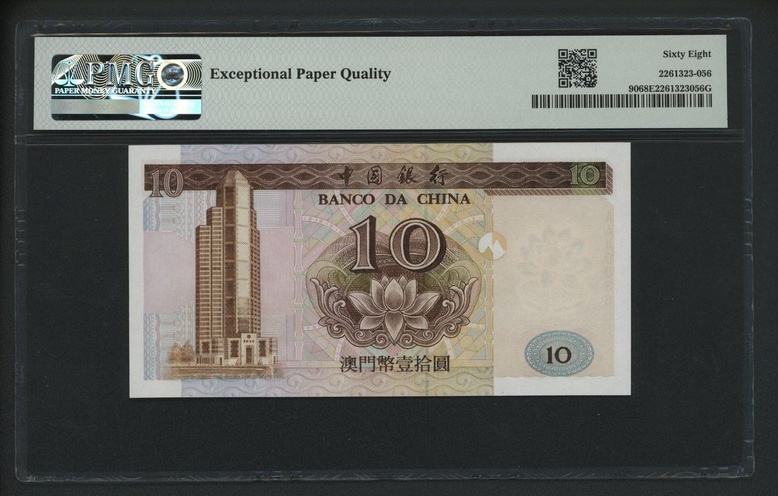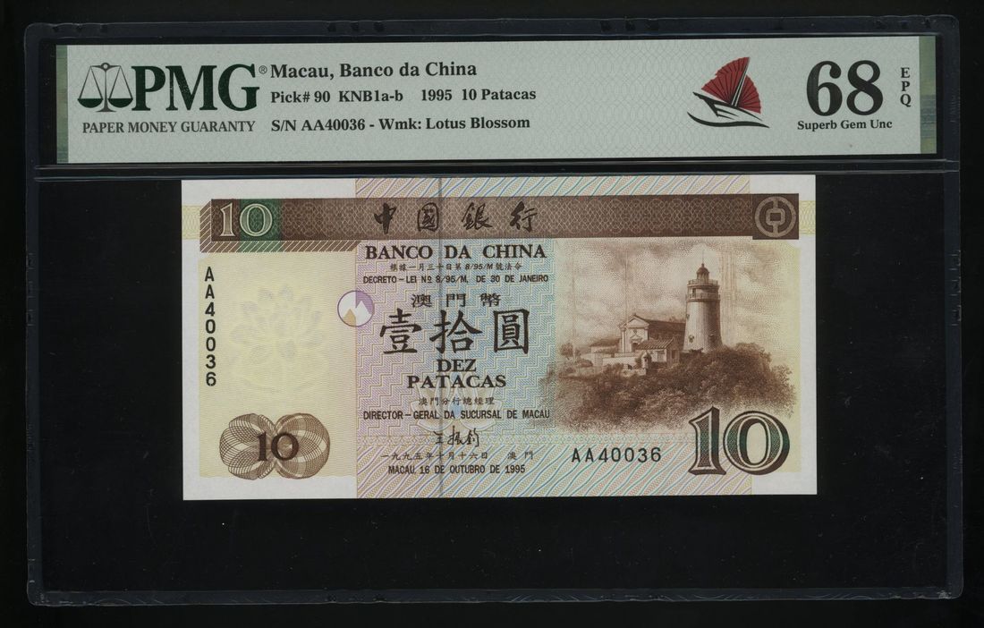 Banco da China, Macau, 10 patacas, 1995, serial number AA 40036, (Pick 90), PMG 68EPQ
