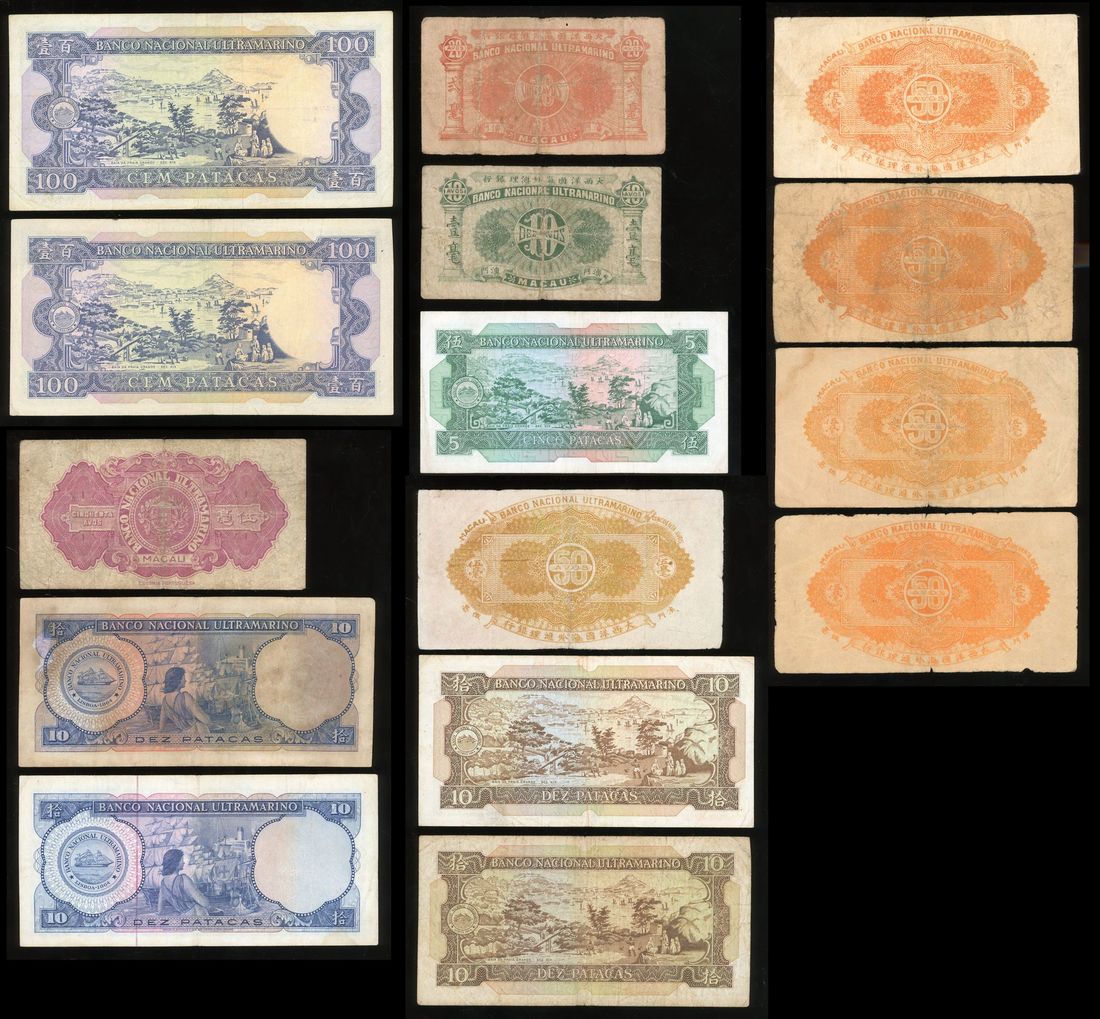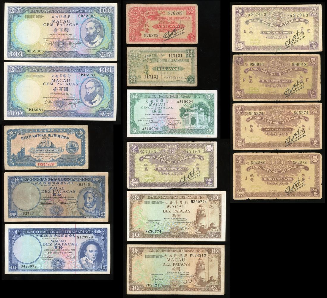 Banco Nacional Ultramarino, Macau, a group of 15x, consisting of 10, 20 and 6x 50 avos, 5, 4x10 and 2x100 patacas, various years type, from 1920, 1944 to 1984, serial number 117131, 976209, 471673, 492943, 996918, 504580, 505274, FR814209F, AA18004, PU24213, MZ30774, 8429979, 462748, QD52005, PP46981 respectively,
