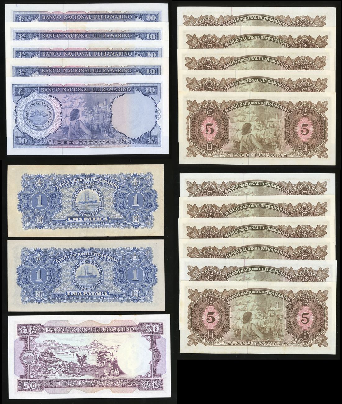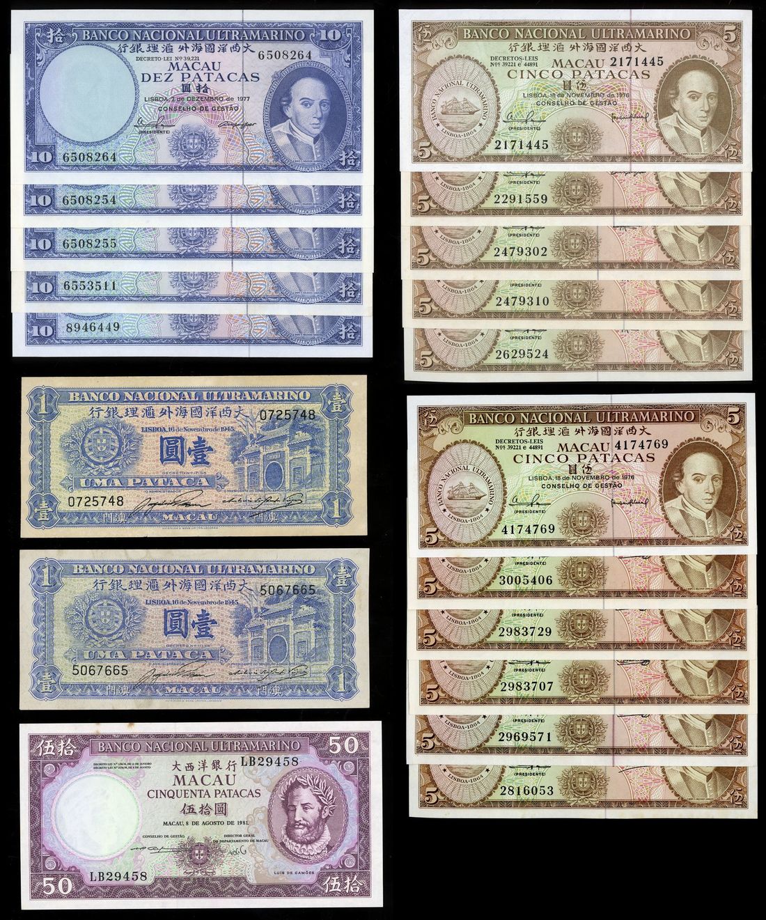 Banco Nacional Ultramarino, a group of 20 notes consisting of 2x 1 patacas, 1945, serial number 0725748, 5067665, 11x 5 patacas, 1976, serial number 2171445, 2291559, 2479302, 2479310, 2629524, 2816053, 2969571, 2983707, 2983729, 3005406, 4174769, 6x 10 patacas, 1977, serial number 6508252, 6508254-5, 6508264, 6553511, 8946449 and 1x 50 patacas, 1981, serial number LB29458,