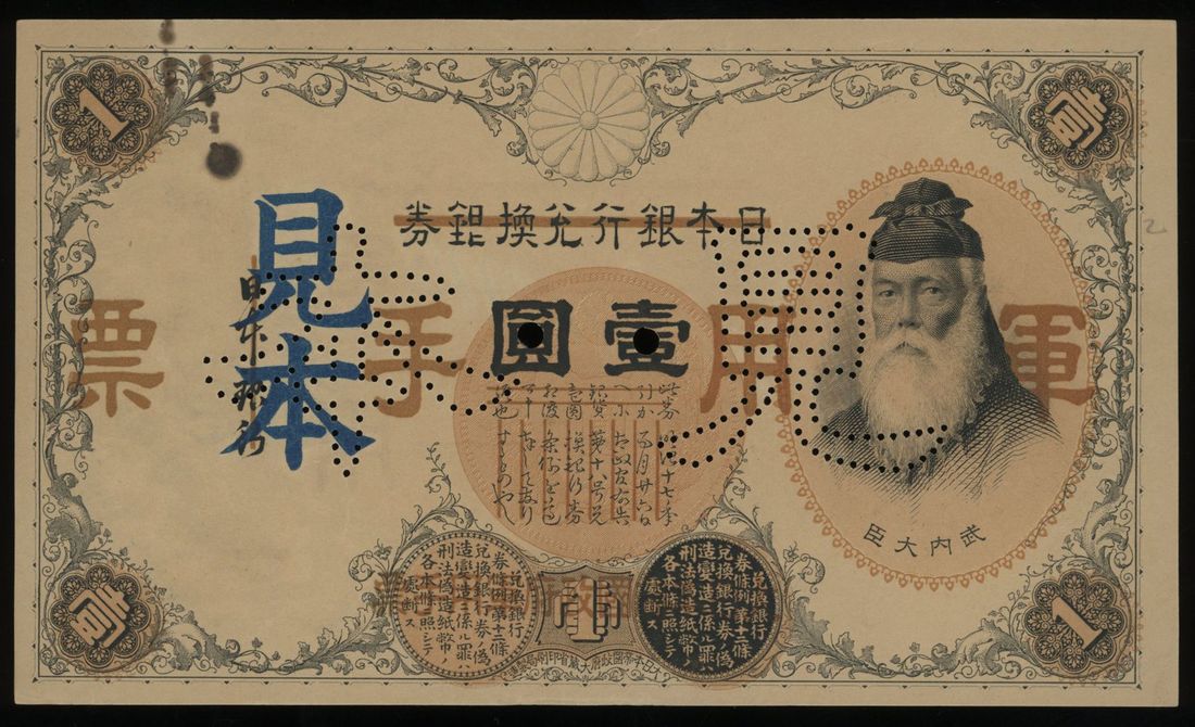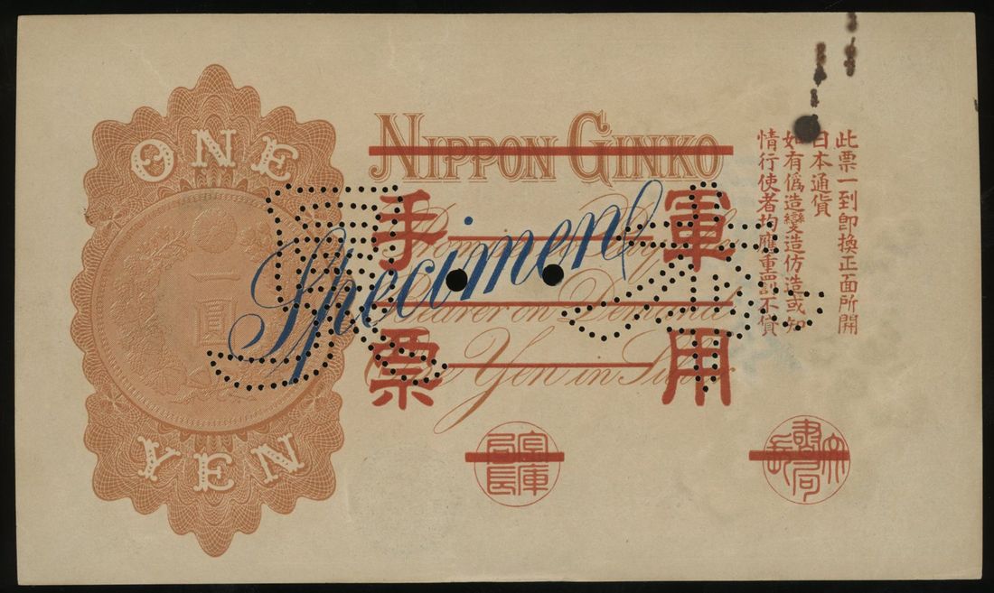 Japan Military, specimen 1 yen, ND (1938), (Pick M23s) stained, minor rust stain at top left, pinholes, about uncirculated