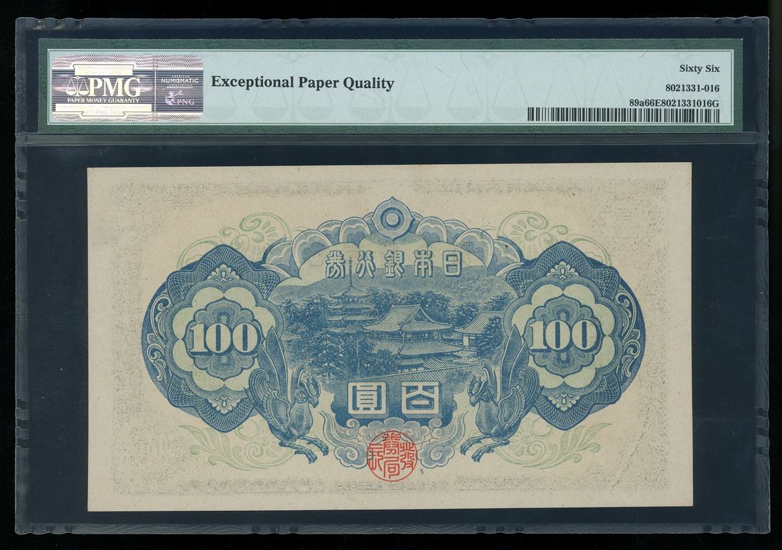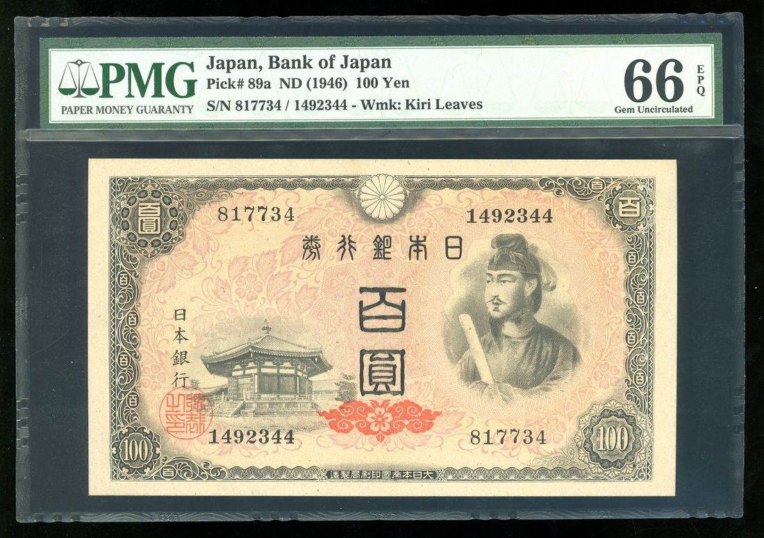Bank of Japan, 100 yen, ND (1946), serial number 817734 / 1492344, (Pick 89a), PMG 66EPQ, only 1 example graded higher in the PMG population report